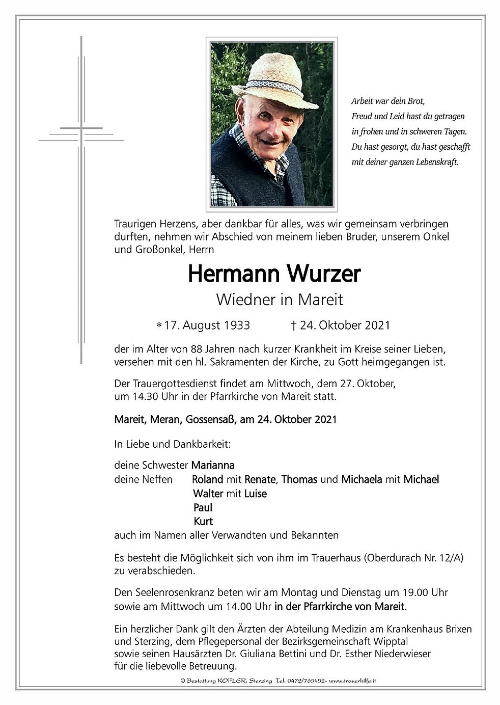 Der Trauergottesdienst findet am Mittwoch, dem 27. Oktober, um 14.30 Uhr in der Pfarrkirche von Mareit statt.