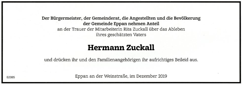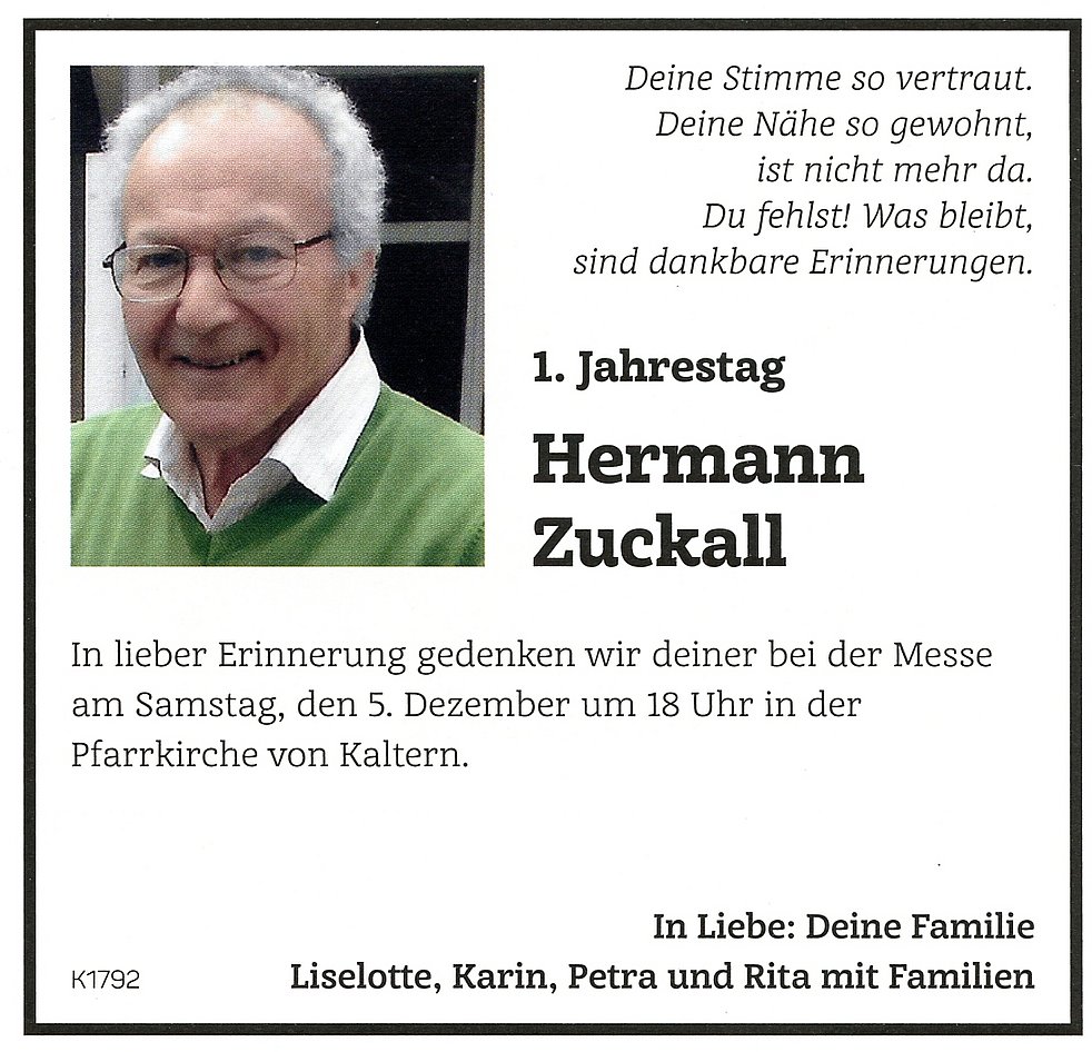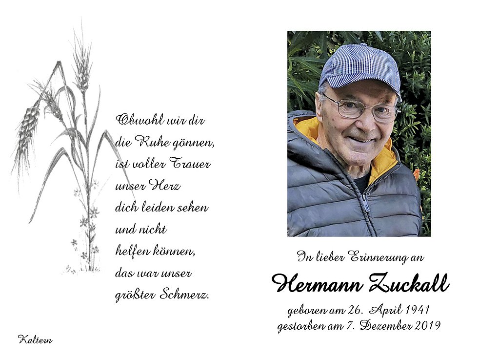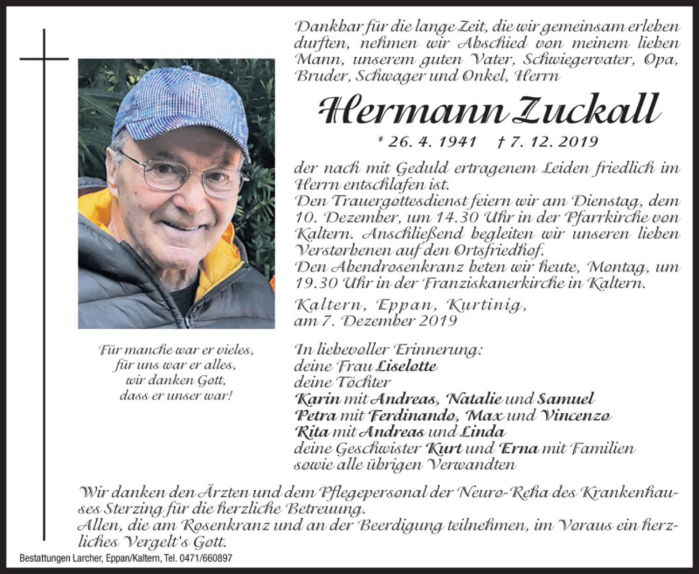 Den Trauergottesdienst feiern wir am Dienstag, dem 10. Dezember, um 14.30 Uhr in der Pfarrkirche von Kaltern. Anschließend begleiten wir unseren lieben Verstorbenen auf den Ortsfriedhof.