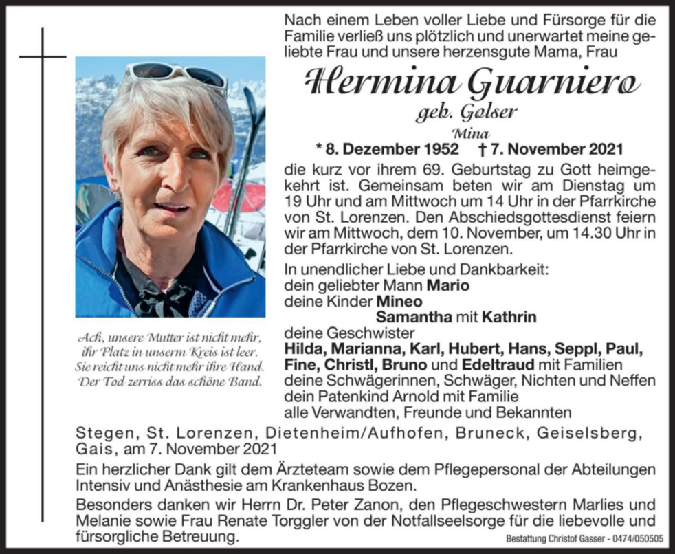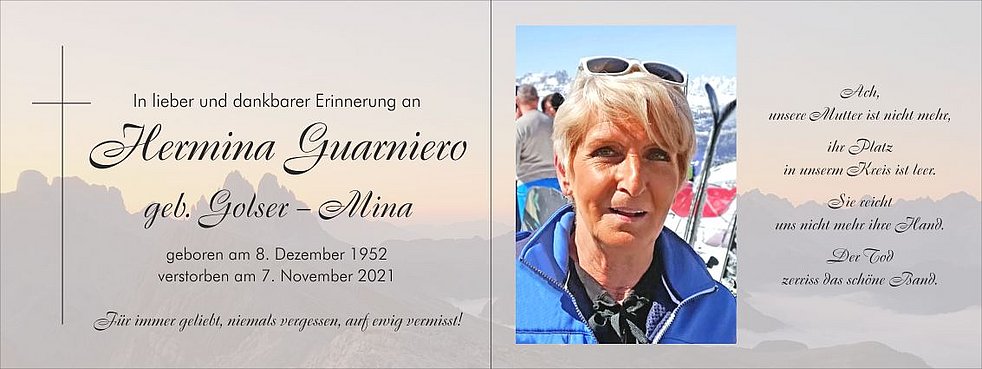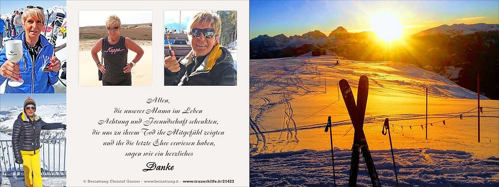 Besonders danken wir Herrn Dr. Peter Zanon, den Pflegeschwestern Marlies und Melanie sowie Frau Renate Torggler von der Notfallseelsorge für die liebevolle und fürsorgliche Betreuung.