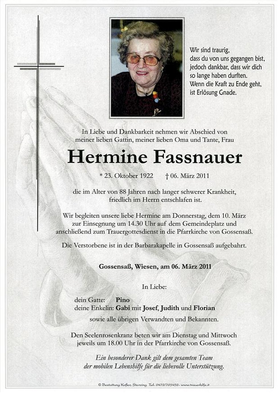 Ich war am 10. März 2011 zufällilg vor der Spitalskirche in Sterzing und habe über den Partezettel vom Tod meiner Tante "Minni" erfahren.