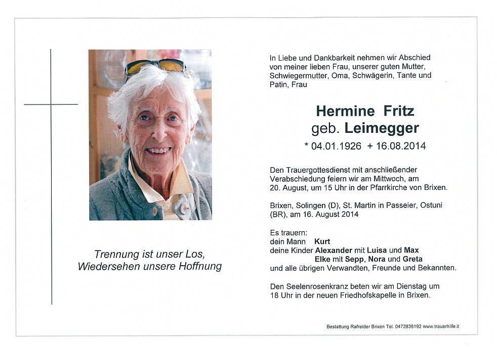 In Liebe und Dankbarkeit nehmen wir Abschied von meiner lieben Frau, unserer guten Mutter, Schwiegermutter, Oma, Schwägerin, Tante und Patin, Frau