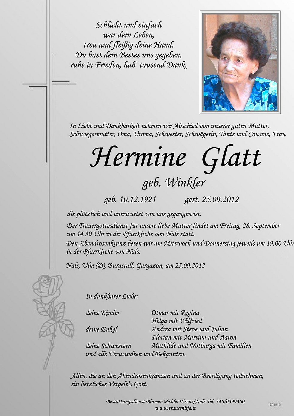 Der Trauergottesdienst für unsere liebe Mutter findet am Freitag, 28. September