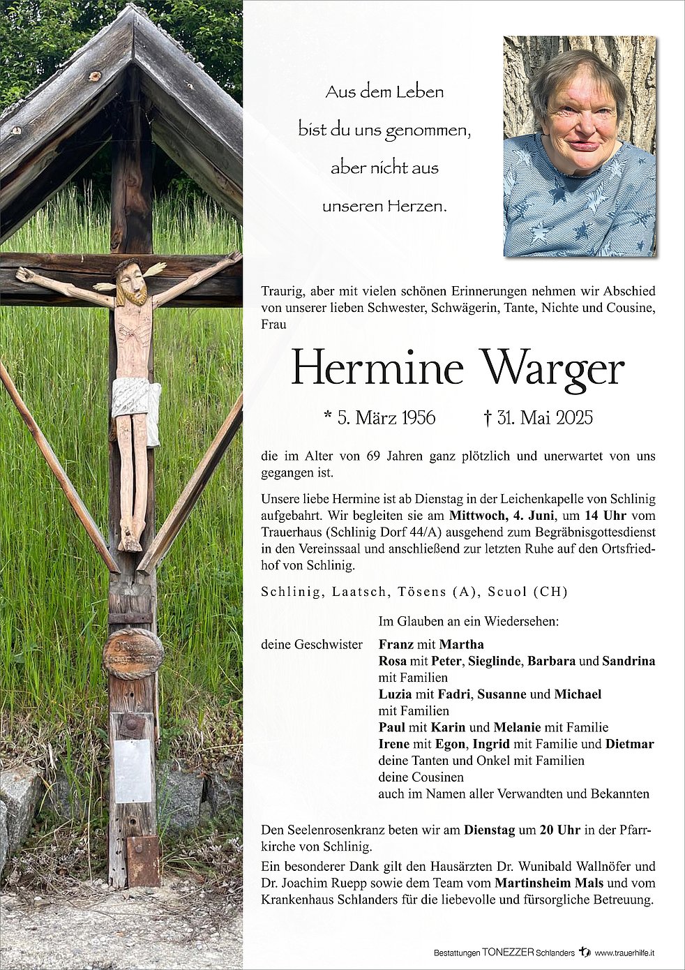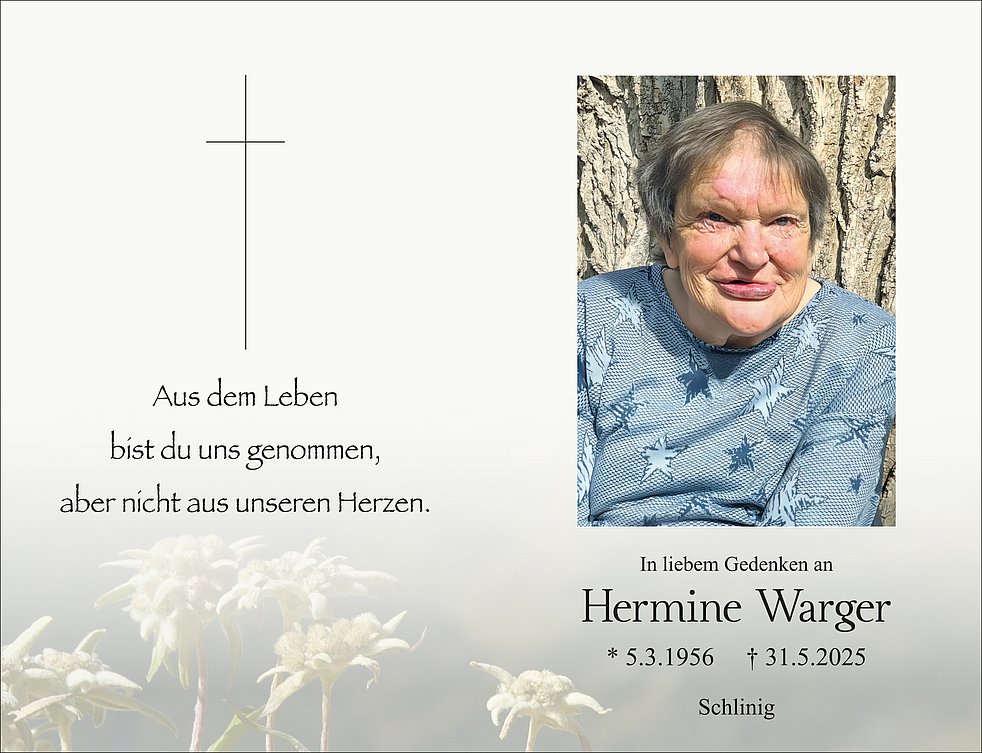 Unsere liebe Hermine ist ab Dienstag in der Leichenkapelle von Schlinig aufgebahrt. Wir begleiten sie am Mittwoch, 4. Juni, um 14 Uhr vom Trauerhaus (Schlinig Dorf 44/A) ausgehend zum Begräbnisgottesdienst in den Vereinssaal und anschließend zur letzten Ruhe auf den Ortsfriedhof von Schlinig.