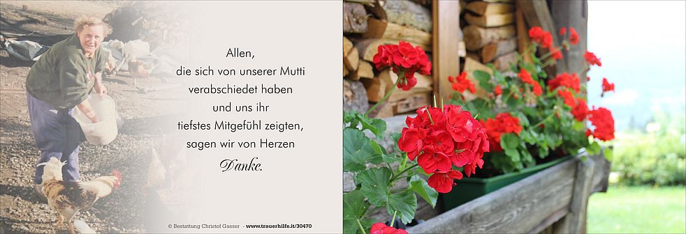 Traurig, dass wir sie verloren haben, dankbar, dass wir sie gehabt haben, und wissend, dass sie uns weiterhin nahe ist, nehmen wir Abschied von meiner lieben Frau, unserer Mutti, Schwiegermutter und Oma, Frau