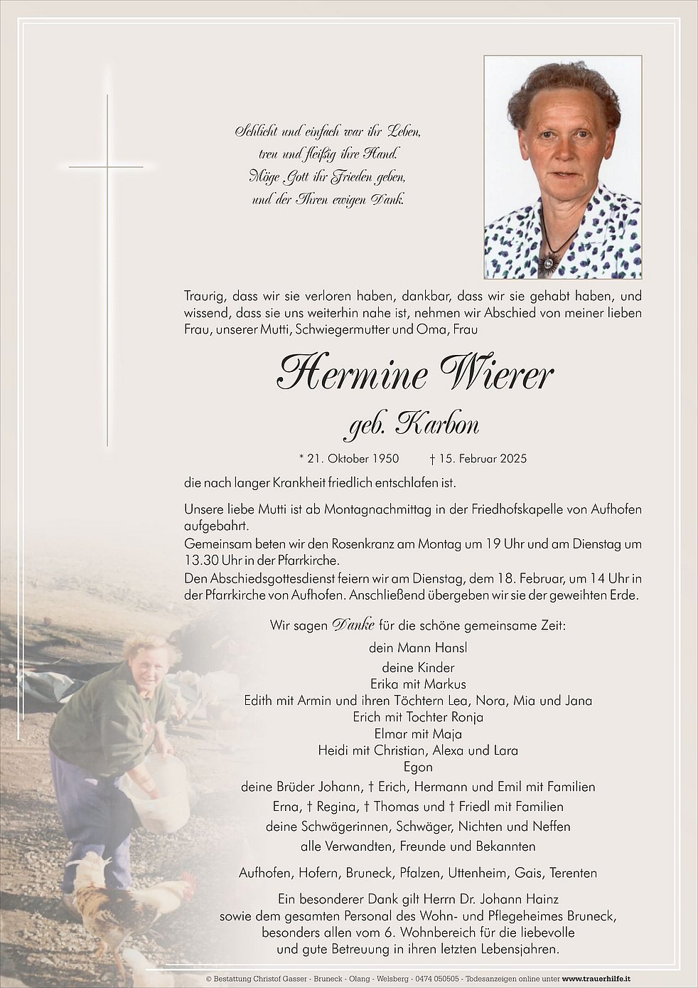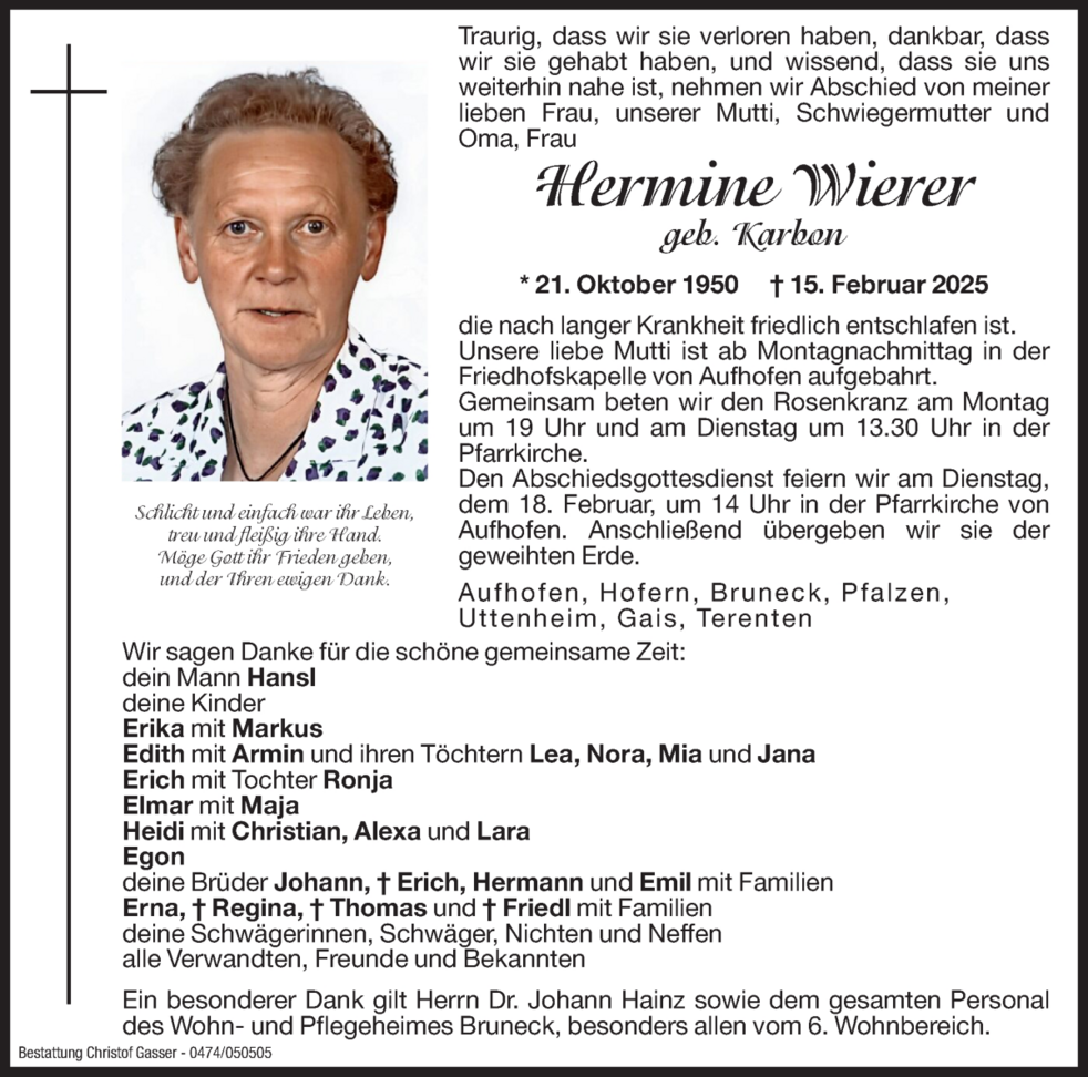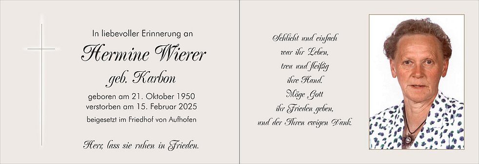 Den Abschiedsgottesdienst feiern wir am Dienstag, dem 18. Februar, um 14 Uhr in der Pfarrkirche von Aufhofen. Anschließend übergeben wir sie der geweihten Erde.