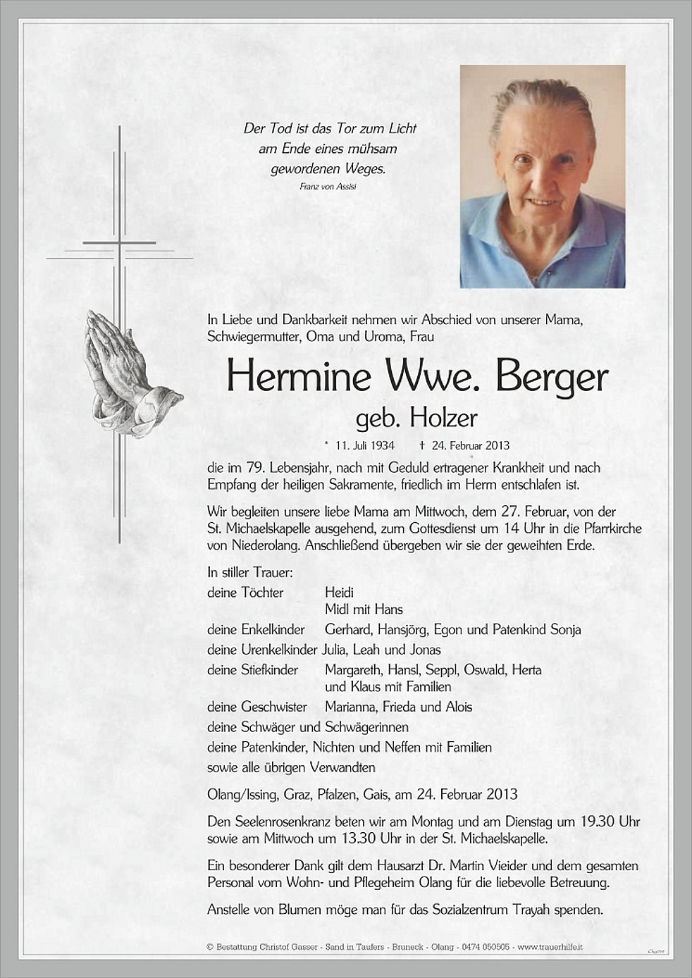 Ein besonderer Dank gilt dem Hausarzt Dr. Martin Vieider und dem gesamten Personal vom Wohn- und Pflegeheim Olang für die liebevolle Betreuung.