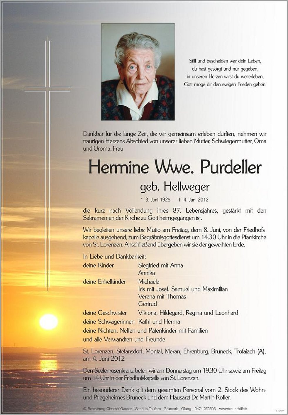 Wir begleiten unsere liebe Mutto am Freitag, dem 8. Juni, von der Friedhofs-kapelle ausgehend, zum Begräbnisgottesdienst um 14.30 Uhr in die Pfarrkirche von St. Lorenzen. Anschließend übergeben wir sie der geweihten Erde.