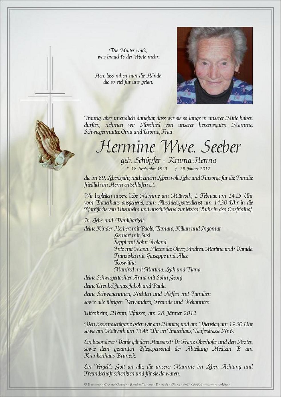 Traurig, aber unendlich dankbar, dass wir sie so lange in unserer Mitte haben durften, nehmen wir Abschied von unserer herzensguten Mamme, Schwiegermutter, Oma und Uroma, Frau