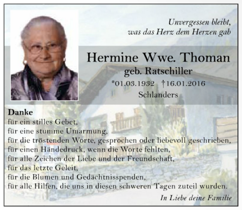 Am Dienstag, 19. Jänner, um 15 Uhr feiern wir den Begräbnisgottesdienst in der Pfarrkirche von Schlanders.