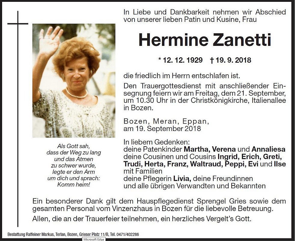 Den Trauergottesdienst mit anschließender Einsegnung feiern wir am Freitag, dem 21. September, um 10.30 Uhr in der Christ-König-Kirche, Italienallee in Bozen.