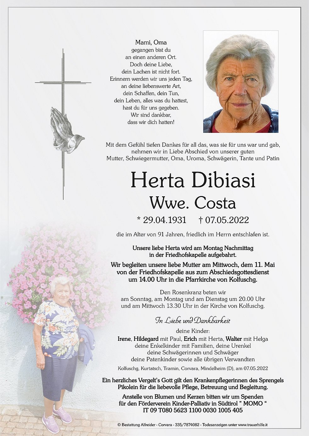 Wir begleiten unsere liebe Mutter am Mittwoch, dem 11. Mai von der Friedhofskapelle aus zum Abschiedsgottesdienst um 14.00 Uhr in die Pfarrkirche von Kolfuschg.