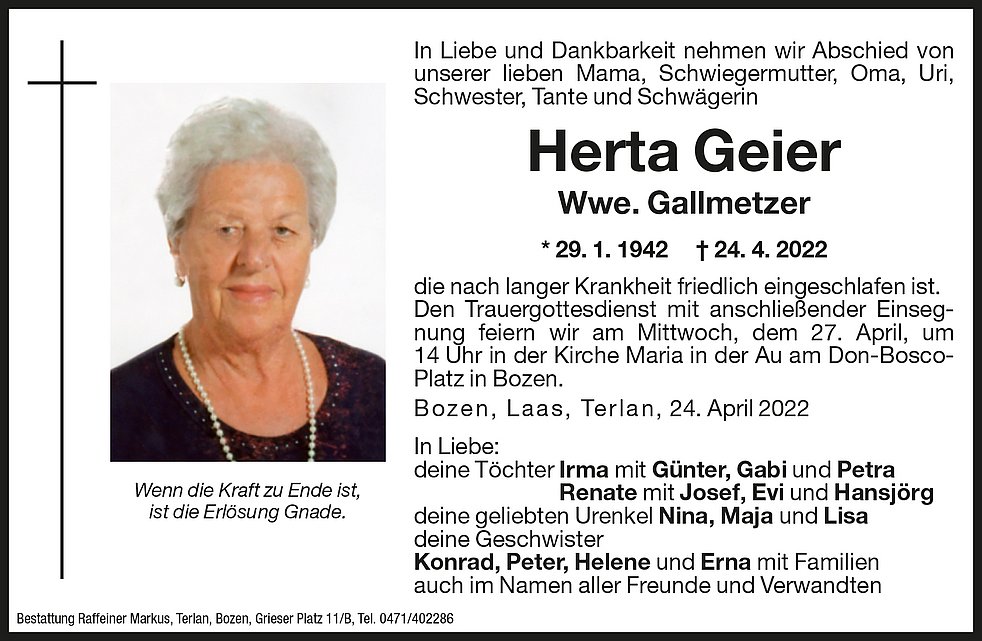 Den Trauergottesdienst mit anschließender Einsegnung feiern wir am Mittwoch, dem 27. April, um 14 Uhr in der Kirche Maria in der Au am Don-Bosco-Platz in Bozen.