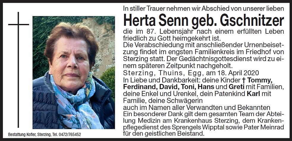 Die Verabschiedung mit anschließender Urnenbeisetzung findet im engsten Familienkreis im Friedhof von Sterzing statt.