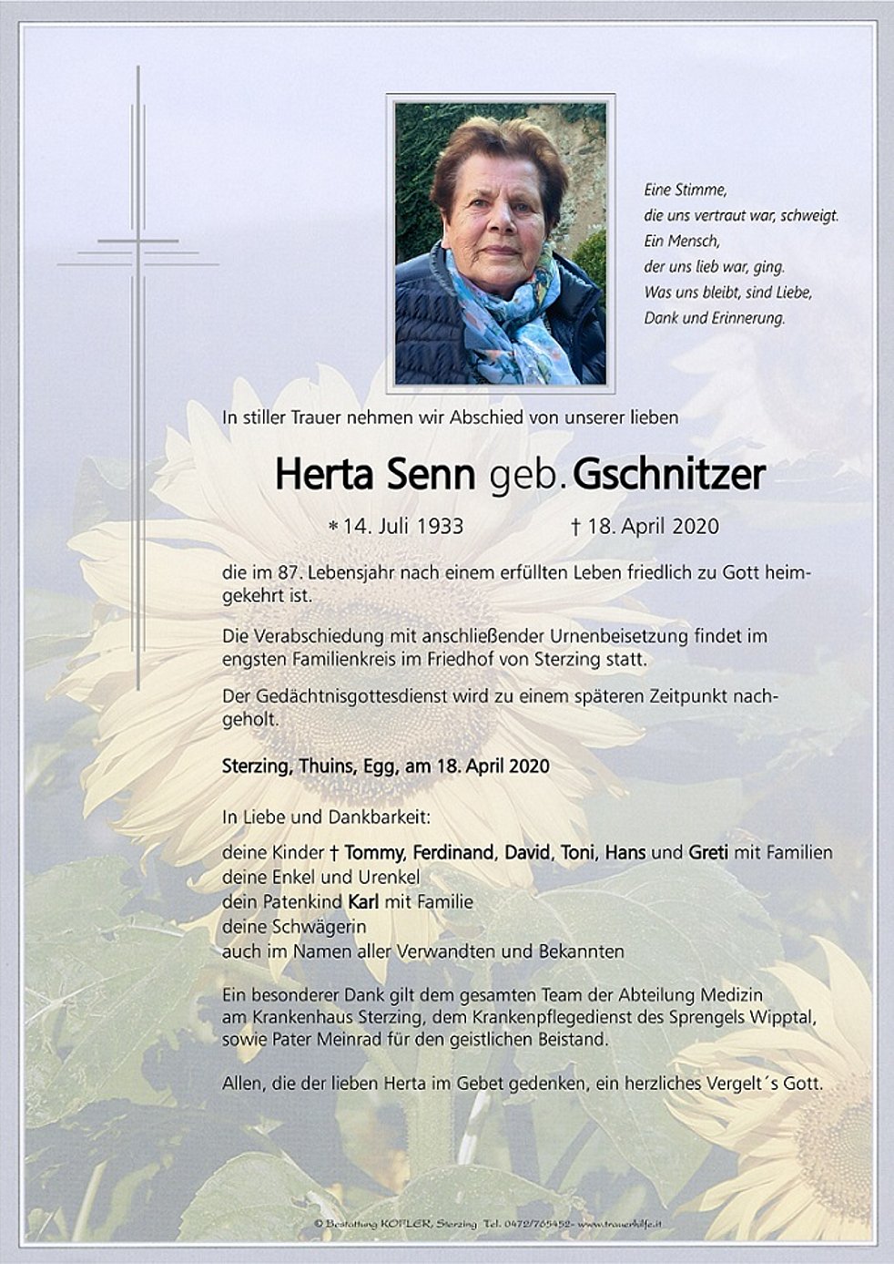 Ein besonderer Dank gilt dem gesamten Team der Abteilung Medizin am Krankenhaus Sterzing, dem Krankenpflegedienst des Sprengels Wipptal sowie Pater Meinrad für den geistlichen Beistand.