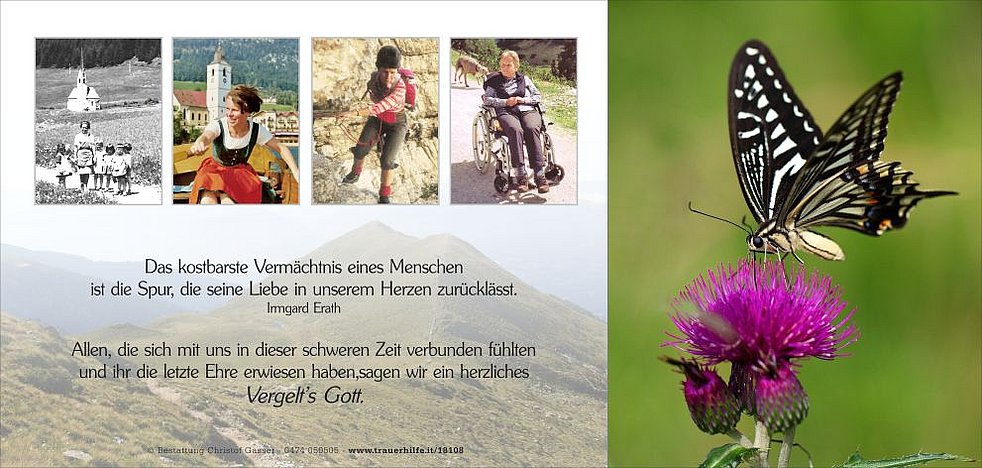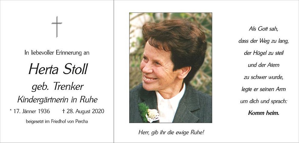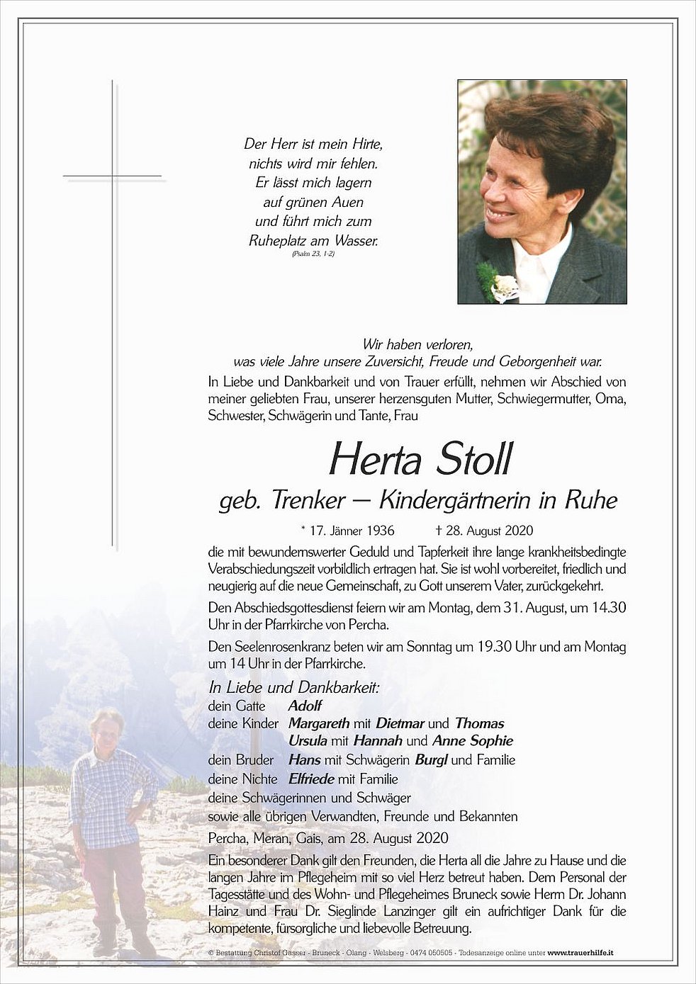 Ein besonderer Dank gilt den Freunden, die Herta all die Jahre zu Hause und die langen Jahre im Pflegeheim mit so viel Herz betreut haben. Dem Personal der Tagesstätte und des Wohn- und Pflegeheimes Bruneck sowie Herrn Dr. Johann Hainz und Frau Dr. Sieglinde Lanzinger gilt ein aufrichtiger Dank für die kompetente, fürsorgliche und liebevolle Betreuung.