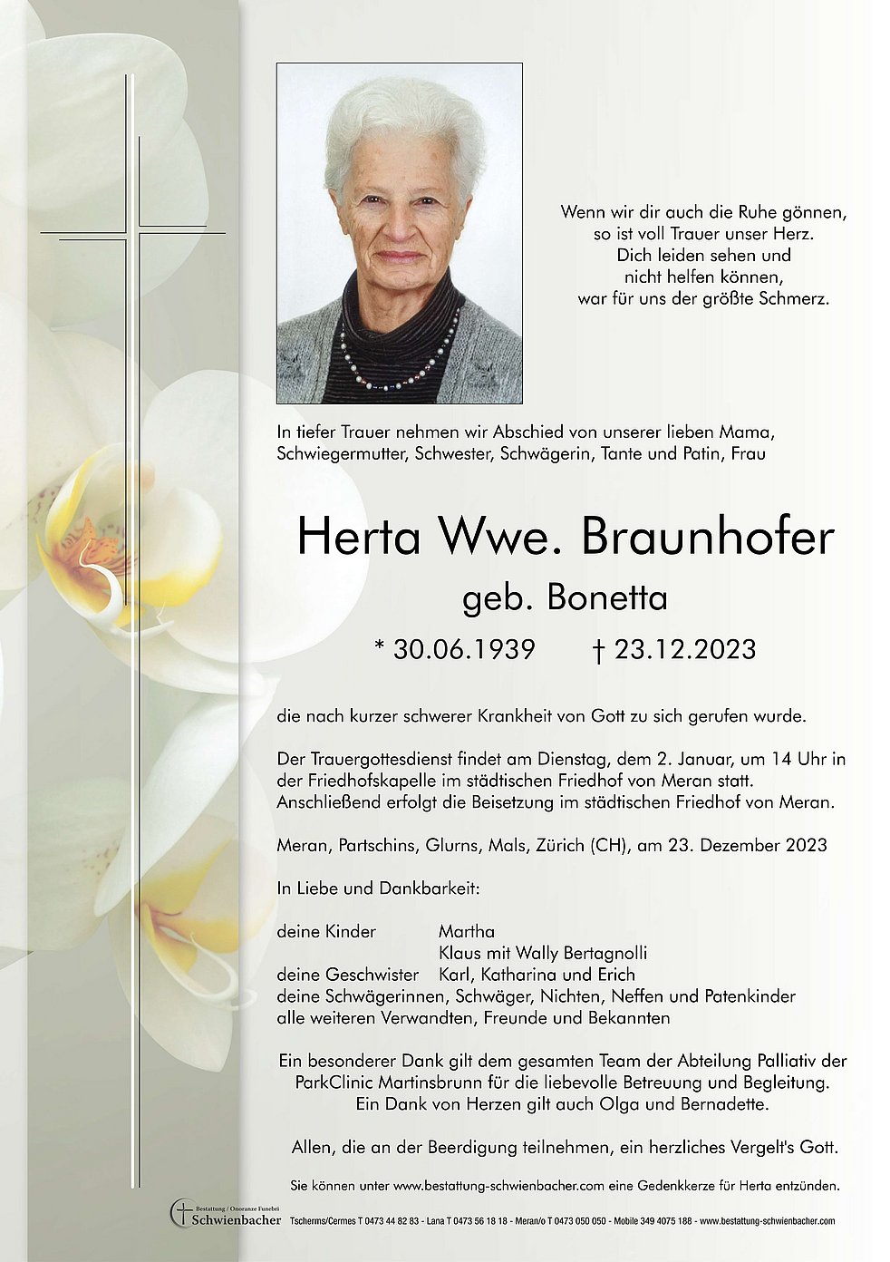 Trauerfeier: 02.01. - 14:00 Uhr Stadtfriedhof Meran