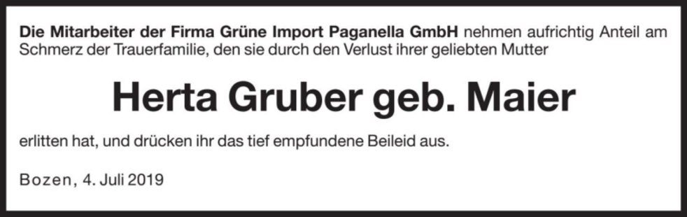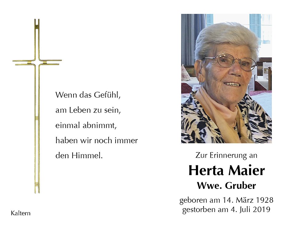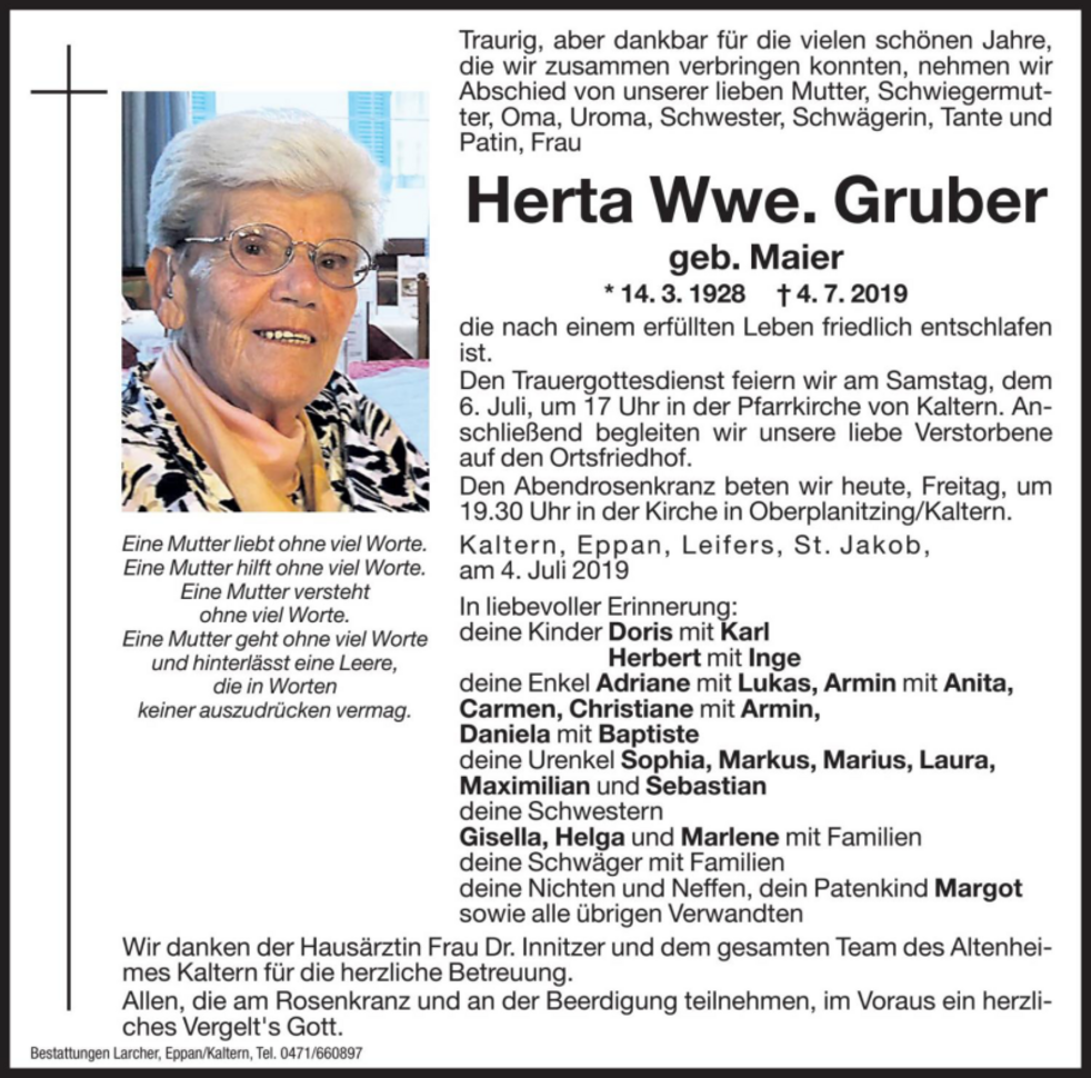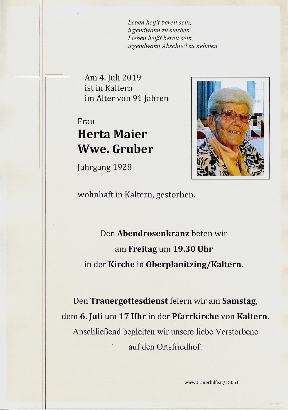 Den Trauergottesdienst feiern wir am Samstag, dem 6. Juli um 17 Uhr in der Pfarrkirche von Kaltern. Anschließend begleiten wir unsere liebe Verstorbene auf den Ortsfriedhof.