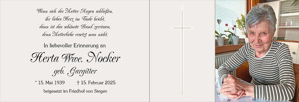 Unsere liebe Mama ist ab Montagnachmittag in der Friedhofskapelle von Stegen aufgebahrt.