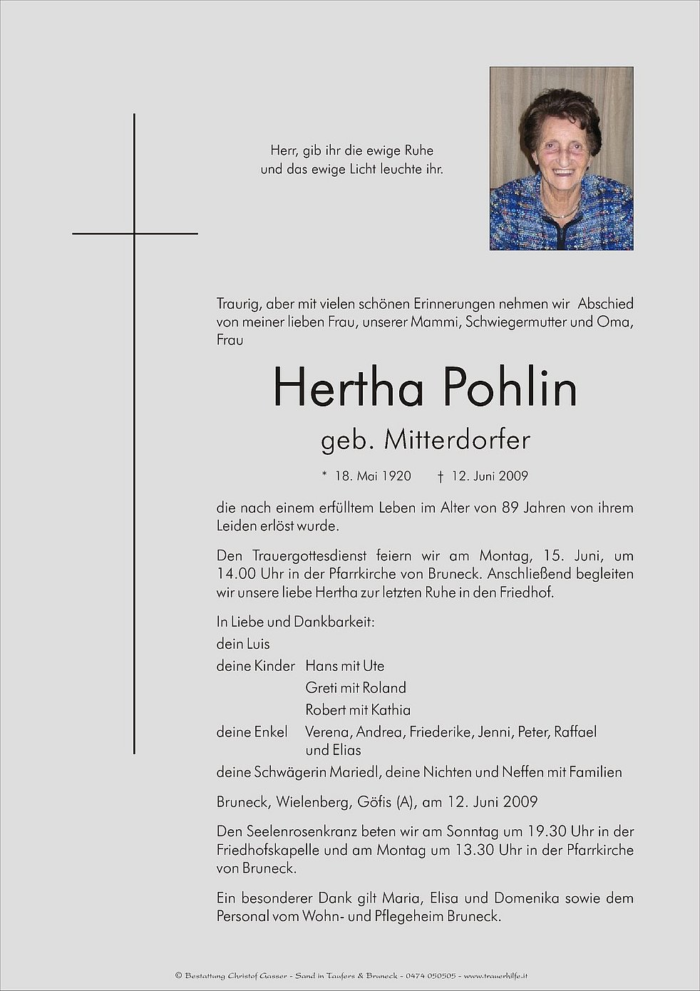 14.00 Uhr in der Pfarrkirche von Bruneck. Anschließend begleiten wir unsere liebe Hertha zur letzten Ruhe in den Friedhof.