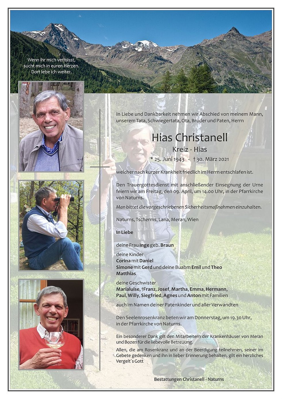 Den Trauergottesdienst mit anschließender Einsegnung der Urne feiern wir am Freitag, den 09. April, um 14.00 Uhr, in der Pfarrkirche von Naturns.