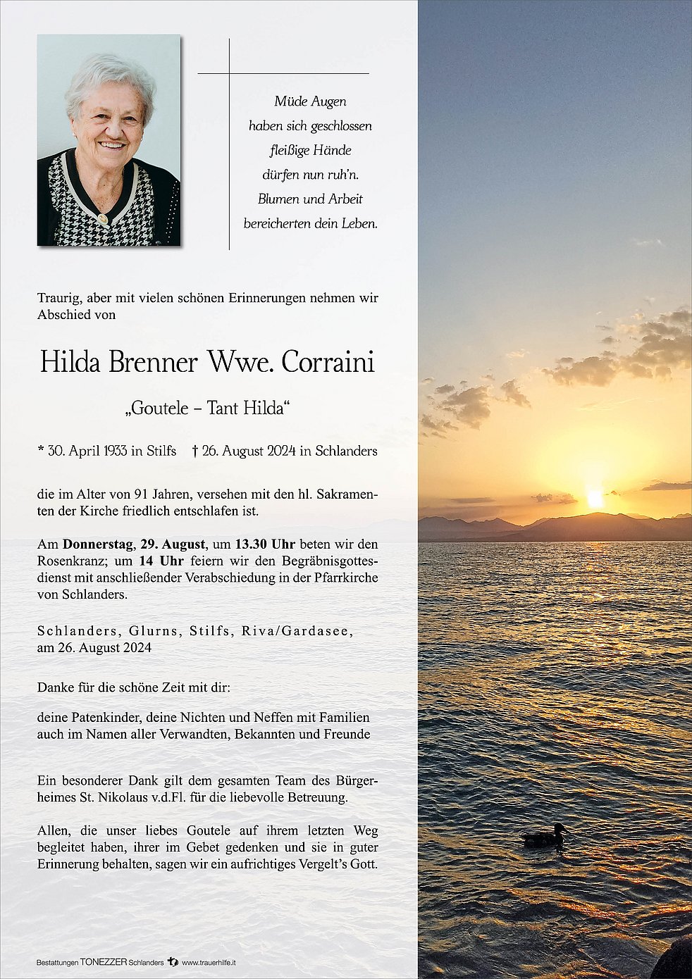 Liebe Hilda, jetzt bist auch du heimgegangen. Als eine freundliche, liebenswerte Frau werde ich dich in guter Erinnerung behalten. Ich wünsche dir Licht und ewige Freude, vereint mit all deinen Lieben und insbesondere mit deiner Schwester Frieda.