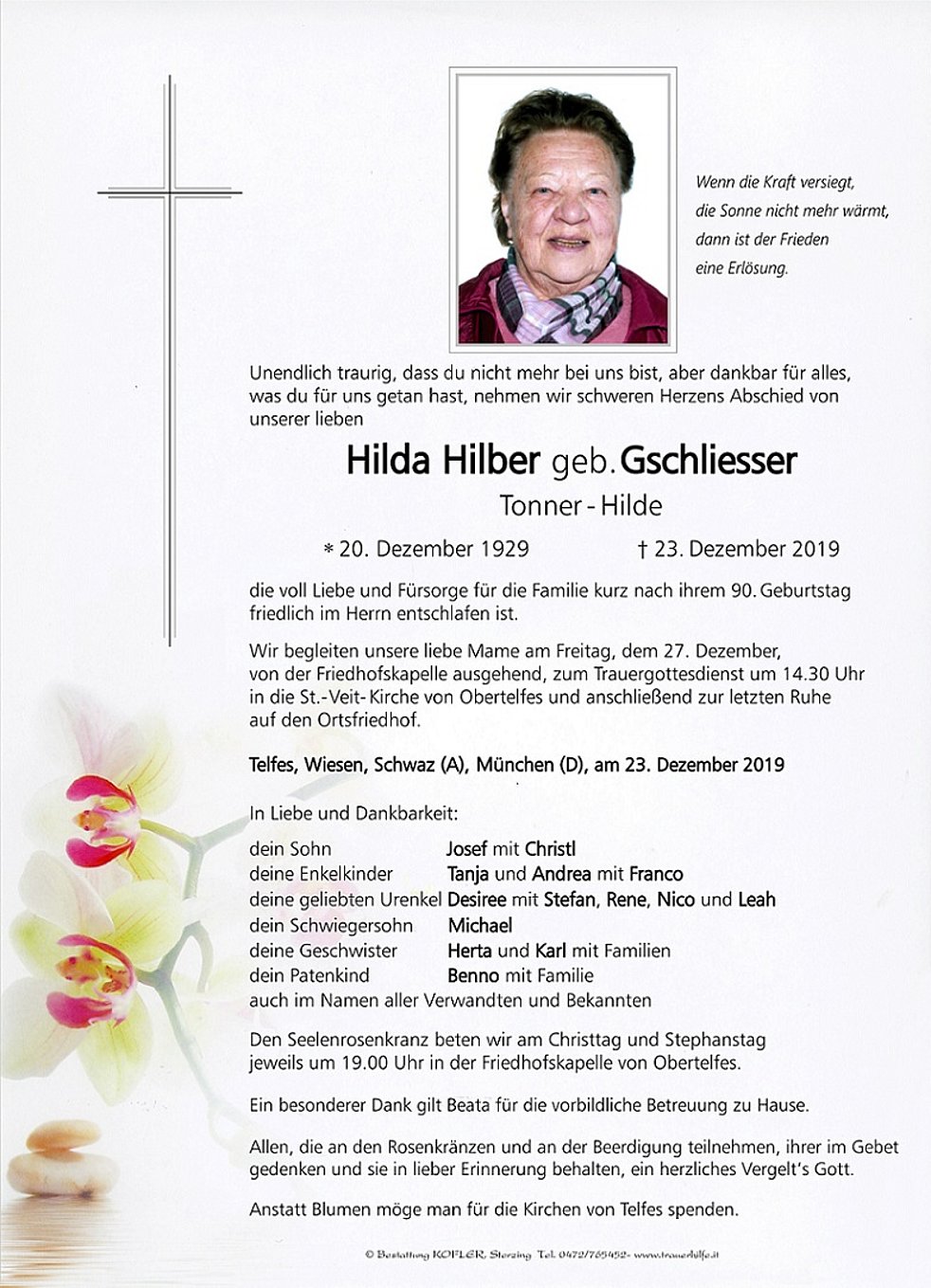 Wir begleiten unsere liebe Mame am Freitag, dem 27. Dezember, von der Friedhofskapelle ausgehend, zum Trauergottesdienst um 14.30 Uhr in die St.- Veit- Kirche von Obertelfes und anschließend zur letzten Ruhe auf den Ortsfriedhof.