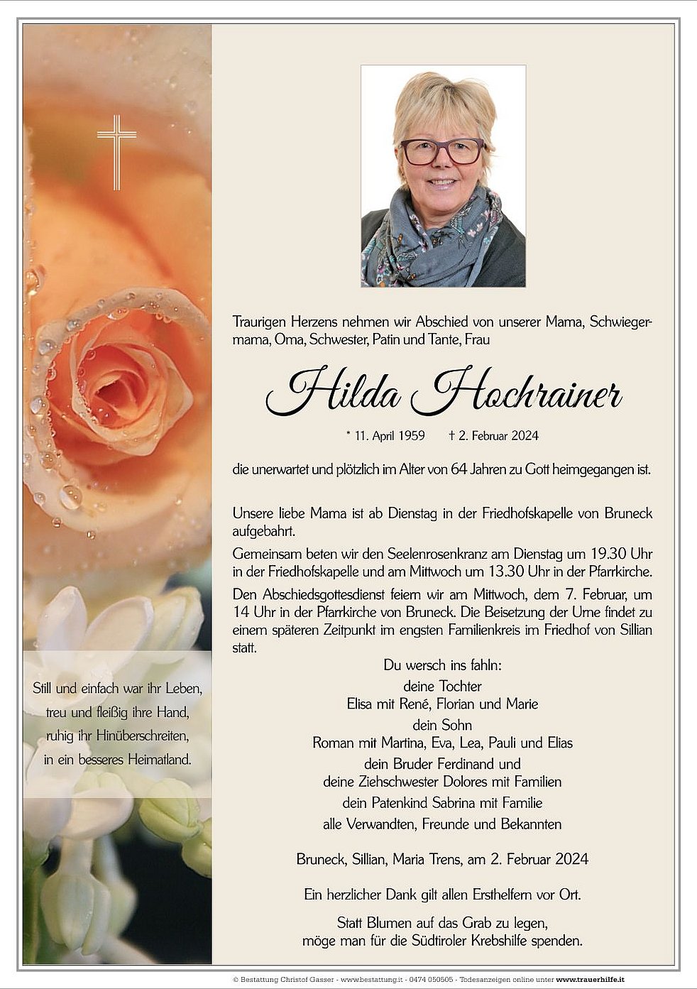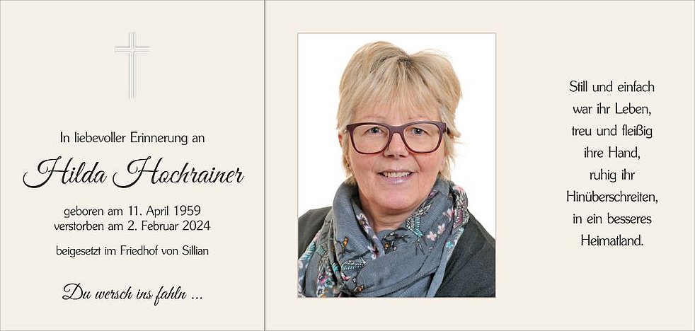 14 Uhr in der Pfarrkirche von Bruneck. Die Beisetzung der Urne findet zu einem späteren Zeitpunkt im engsten Familienkreis im Friedhof von Sillian statt.
