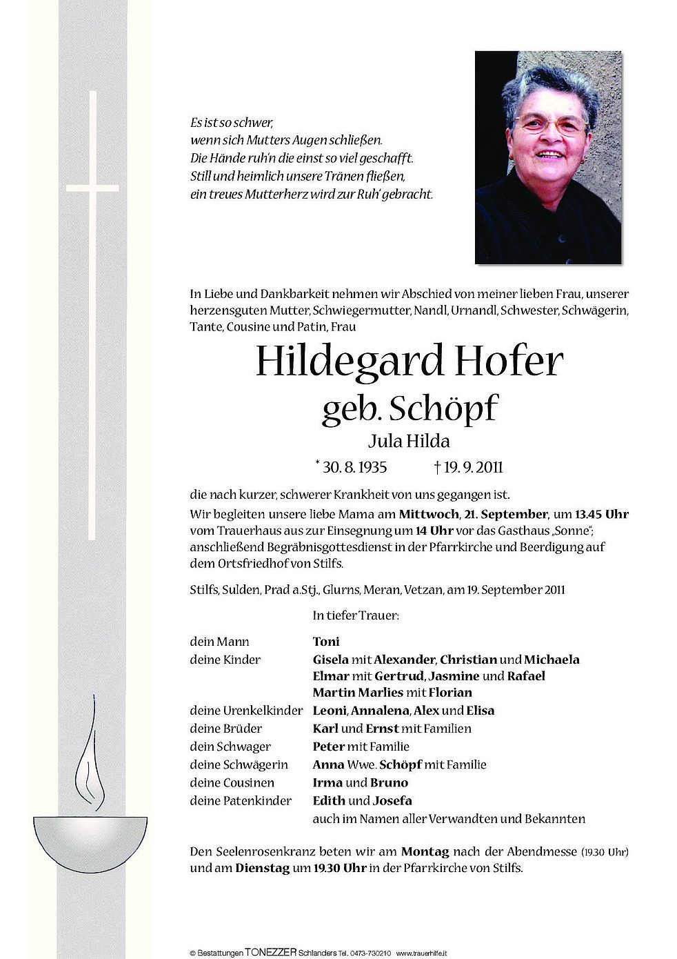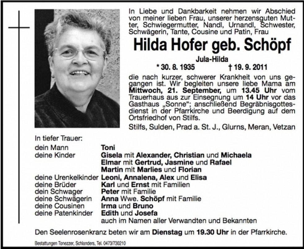 Wir begleiten unsere liebe Mama am Mittwoch, 21. September, um 13.45 Uhr vom Trauerhaus aus zur Einsegnung um 14 Uhr vor das Gasthaus „Sonne“; anschließend Begräbnisgottesdienst in der Pfarrkirche und Beerdigung auf dem Ortsfriedhof von Stilfs.