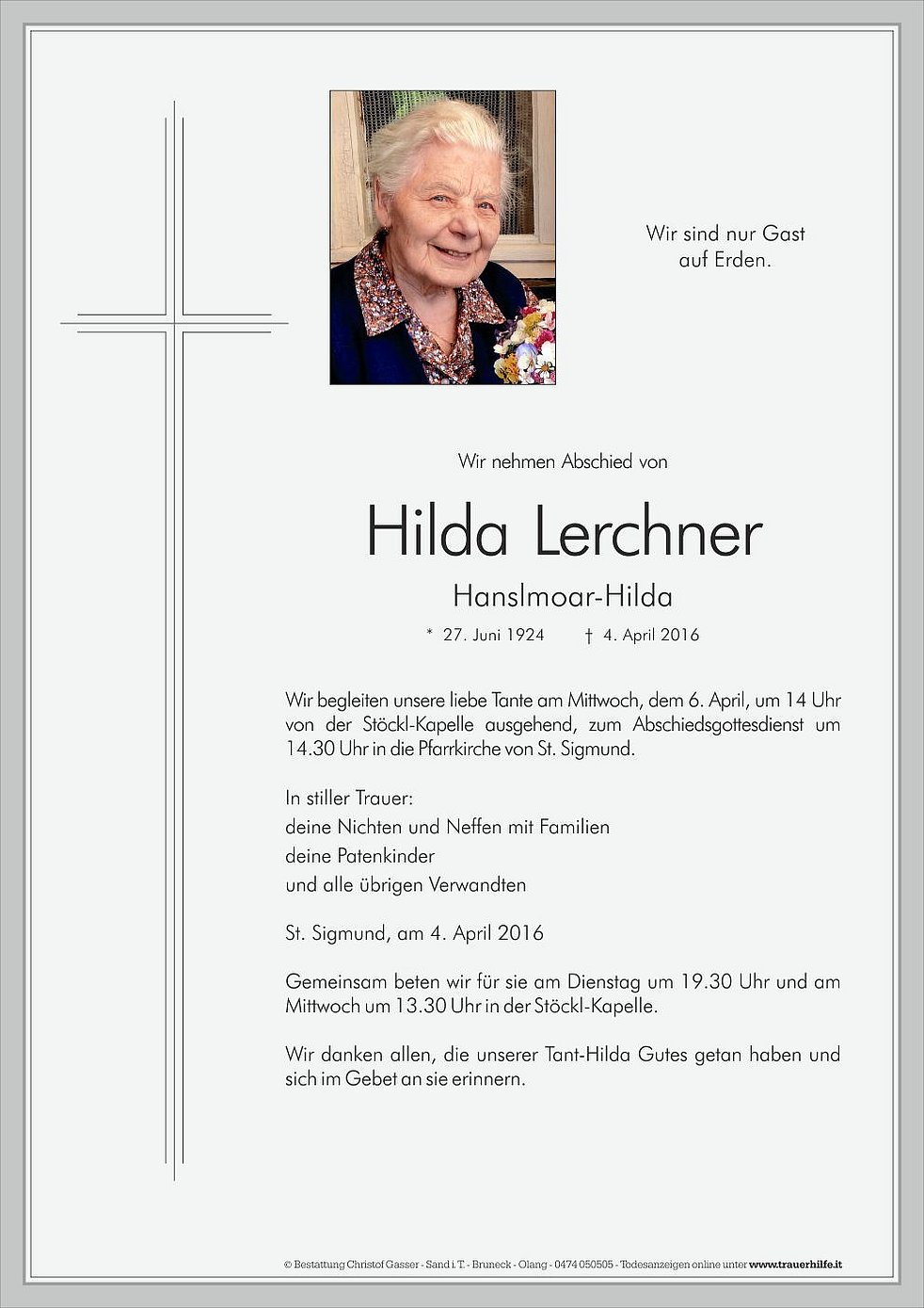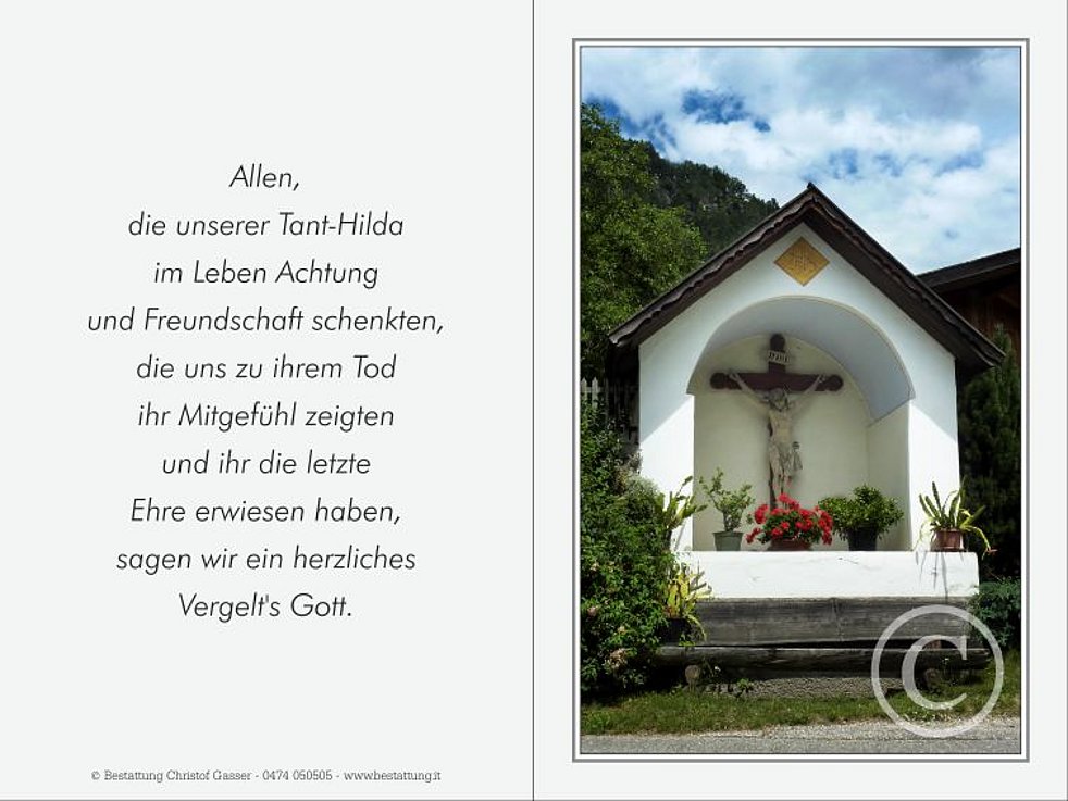Wir danken allen, die unserer Tant-Hilda Gutes getan haben und sich im Gebet an sie erinnern.