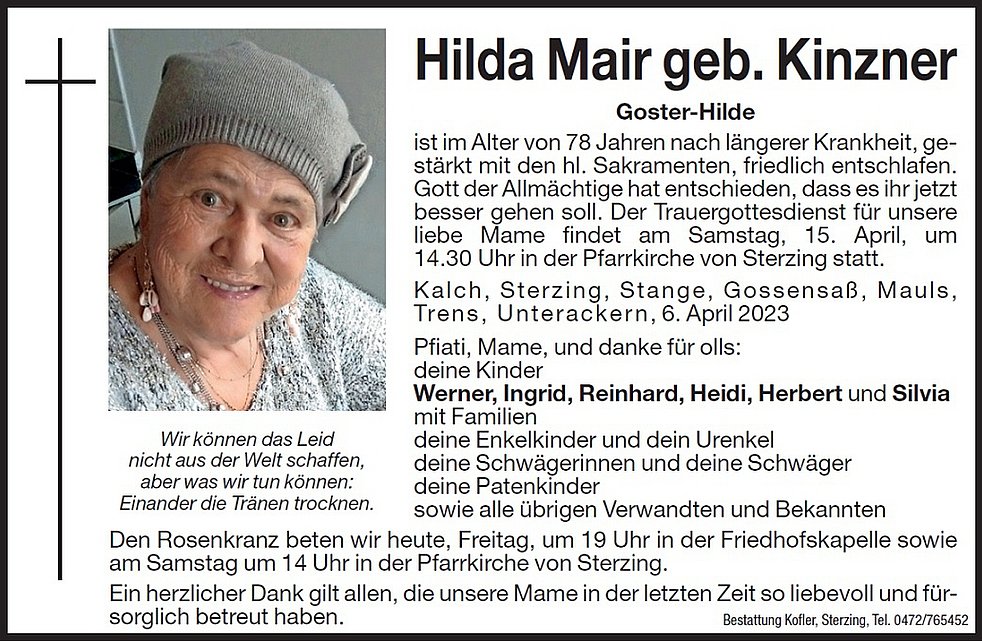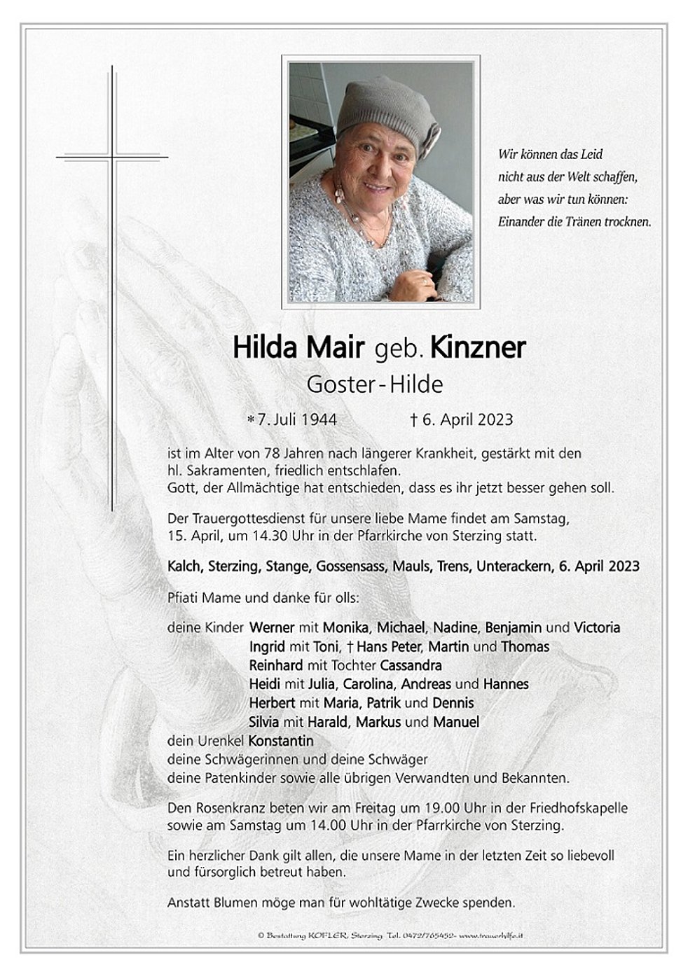 Der Trauergottesdienst für unsere liebe Mame findet am Samstag, 15. April, um 14.30 Uhr in der Pfarrkirche von Sterzing statt.