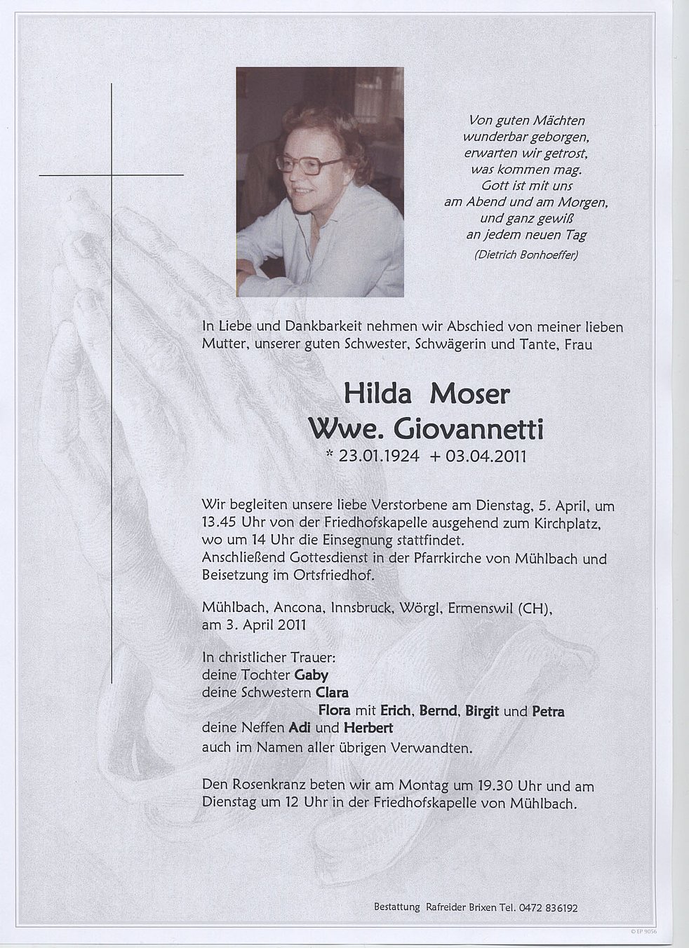 Wir begleiten unsere liebe Verstorbene am Dienstag, 5. April, um 13.45 Uhr von der Friedhofskapelle ausgehend zum Kirchplatz, wo um 14 Uhr die Einsegnung stattfindet.