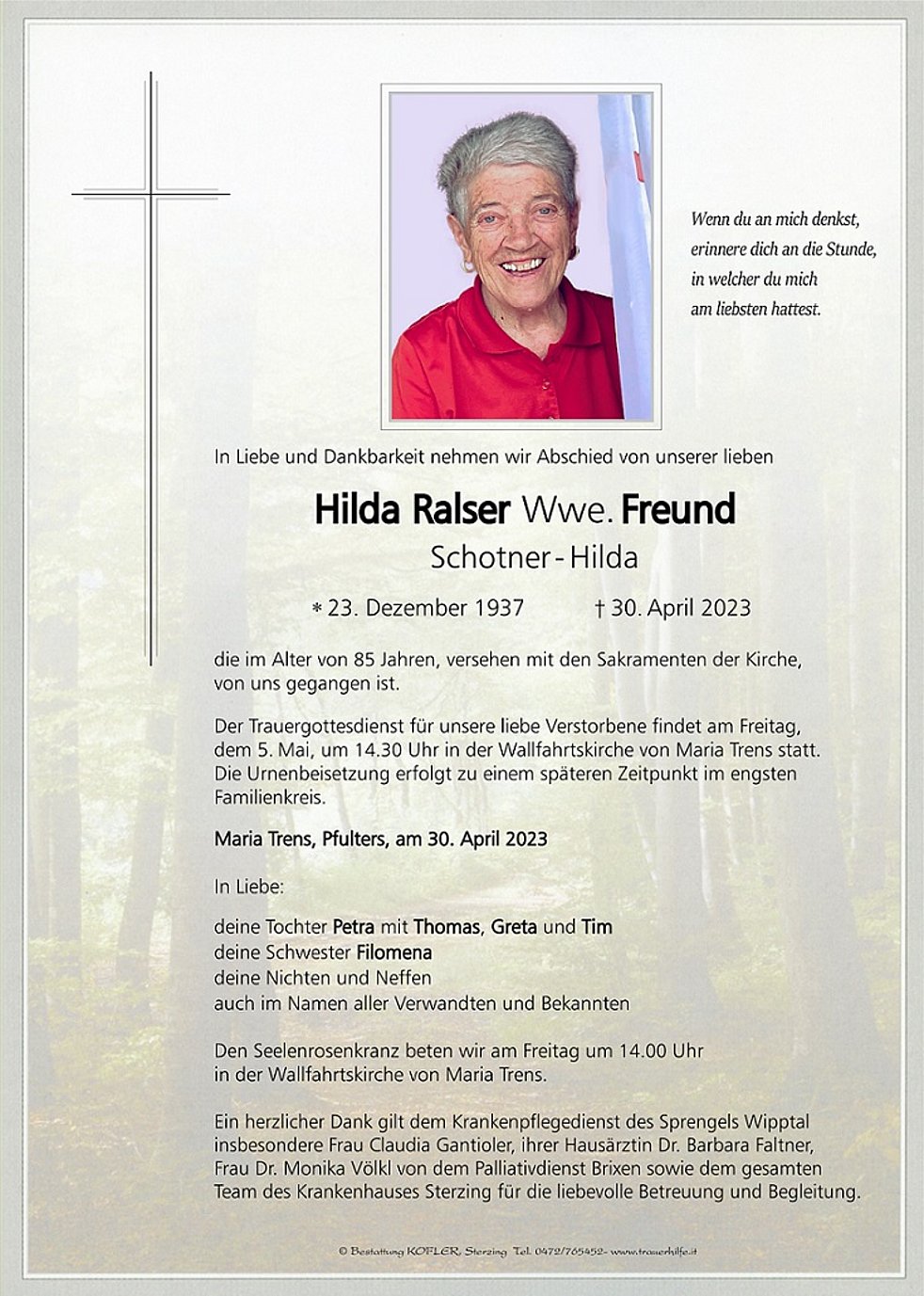 Der Trauergottesdienst für unsere liebe Verstorbene findet am Freitag, dem 5. Mai, um 14.30 Uhr in der Wallfahrtskirche von Maria Trens statt. Die Urnenbeisetzung erfolgt zu einem späteren Zeitpunkt im engsten Familienkreis.