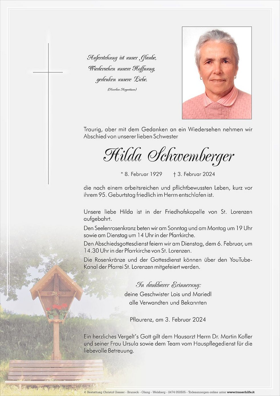 Den Abschiedsgottesdienst feiern wir am Dienstag, dem 6. Februar, um 14.30 Uhr in der Pfarrkirche von St. Lorenzen.