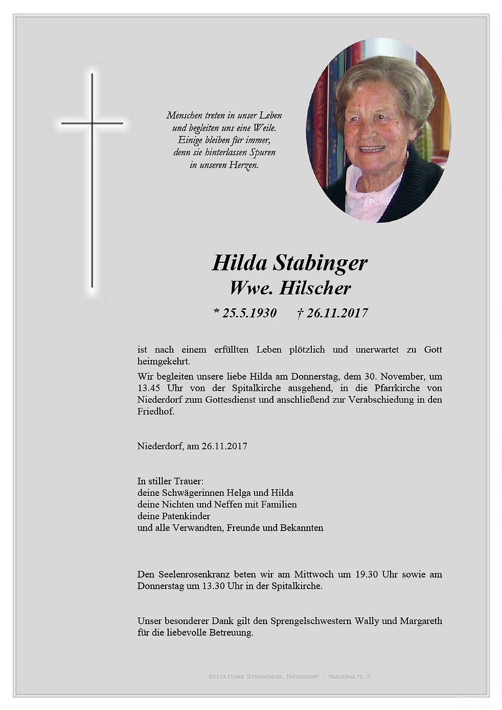 Wir begleiten unsere liebe Hilda am Donnerstag, dem 30. November, um 13.45 Uhr von der Spitalkirche ausgehend, in die Pfarrkirche von Niederdorf zum Gottesdienst und anschließend zur Verabschiedung in den Friedhof.