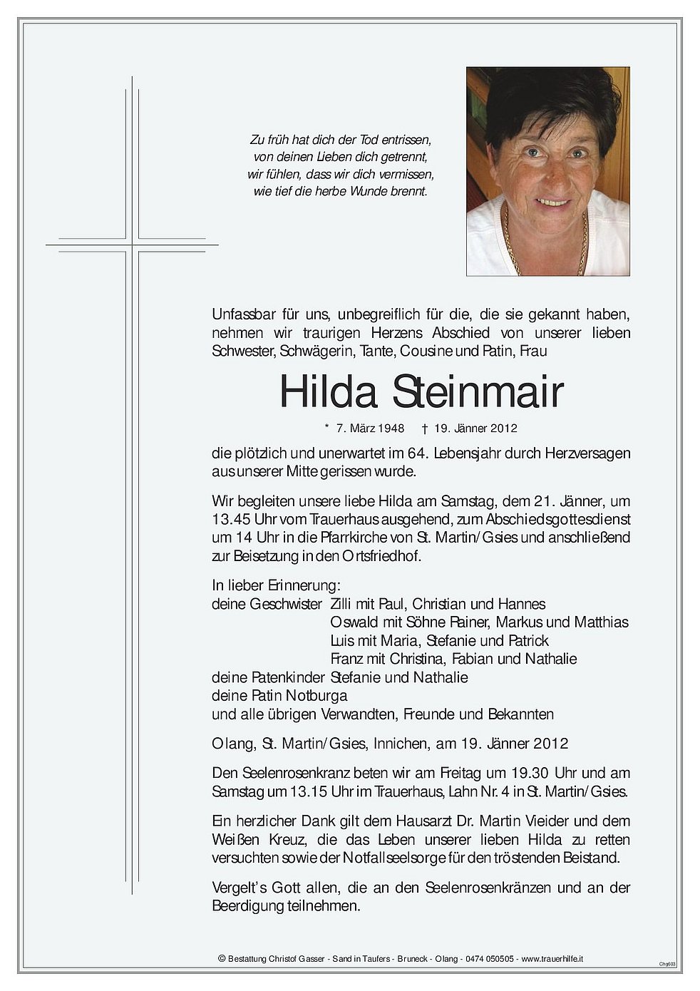 Ein herzlicher Dank gilt dem Hausarzt Dr. Martin Vieider und dem Weißen Kreuz, die das Leben unserer lieben Hilda zu retten versuchten sowie der Notfallseelsorge für den tröstenden Beistand.