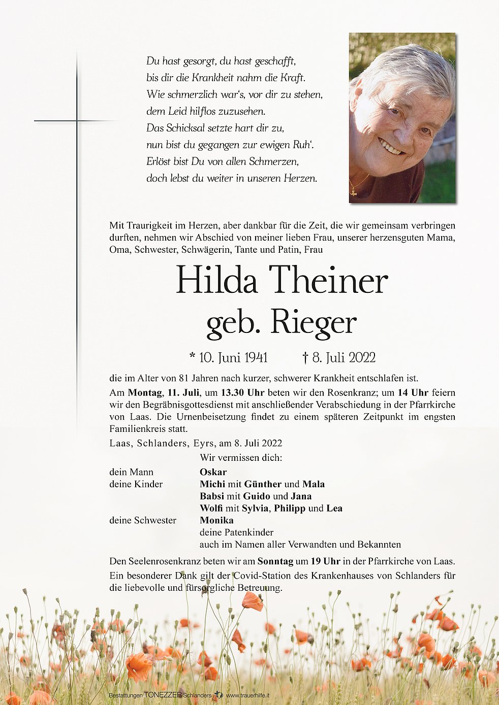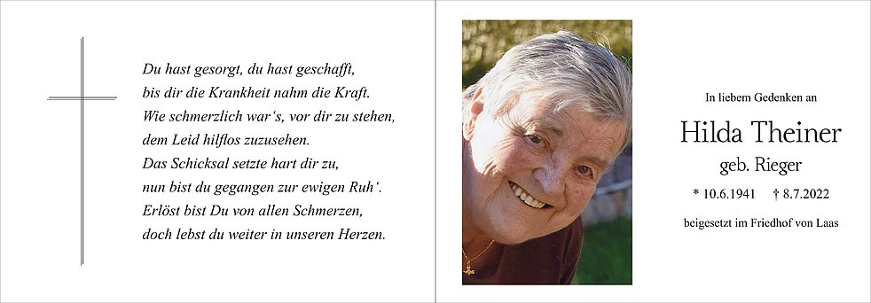 Am Montag, 11. Juli, um 13.30 Uhr beten wir den Rosenkranz; um 14 Uhr feiern wir den Begräbnisgottesdienst mit anschließender Verabschiedung in der Pfarrkirche von Laas.