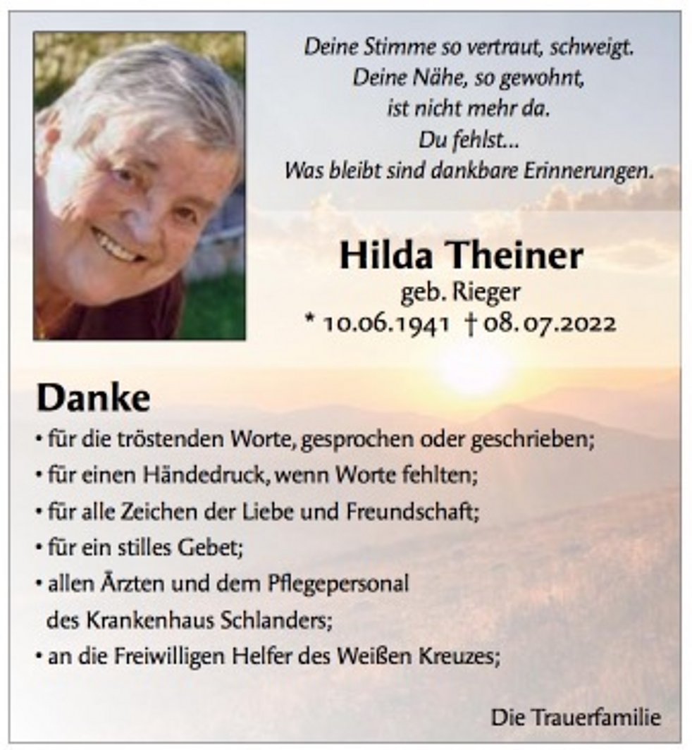Mit Traurigkeit im Herzen, aber dankbar für die Zeit, die wir gemeinsam verbringen durften, nehmen wir Abschied von meiner lieben Frau, unserer herzensguten Mama, Oma, Schwester, Schwägerin, Tante und Patin, Frau