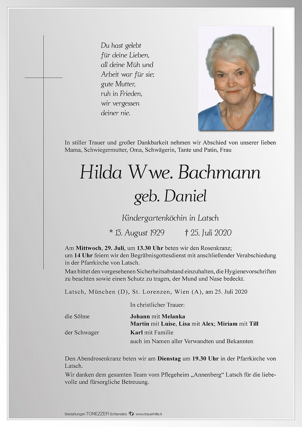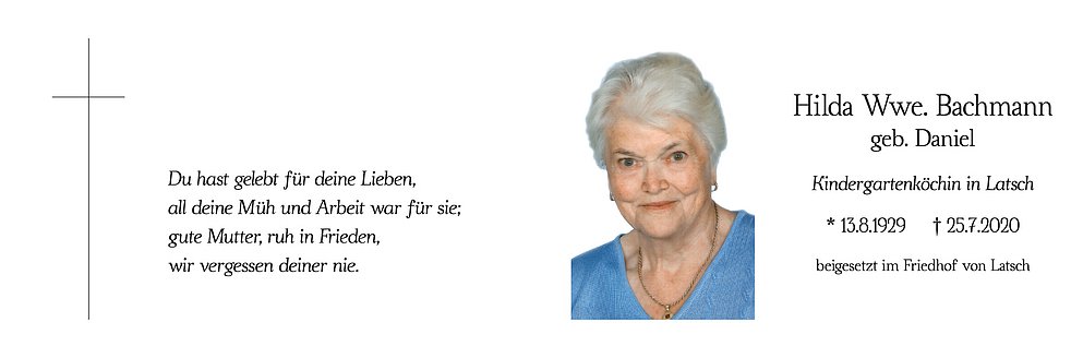 Am Mittwoch, 29. Juli, um 13.30 Uhr beten wir den Rosenkranz; um 14 Uhr feiern wir den Begräbnisgottesdienst mit anschließender Verabschiedung in der Pfarrkirche von Latsch.