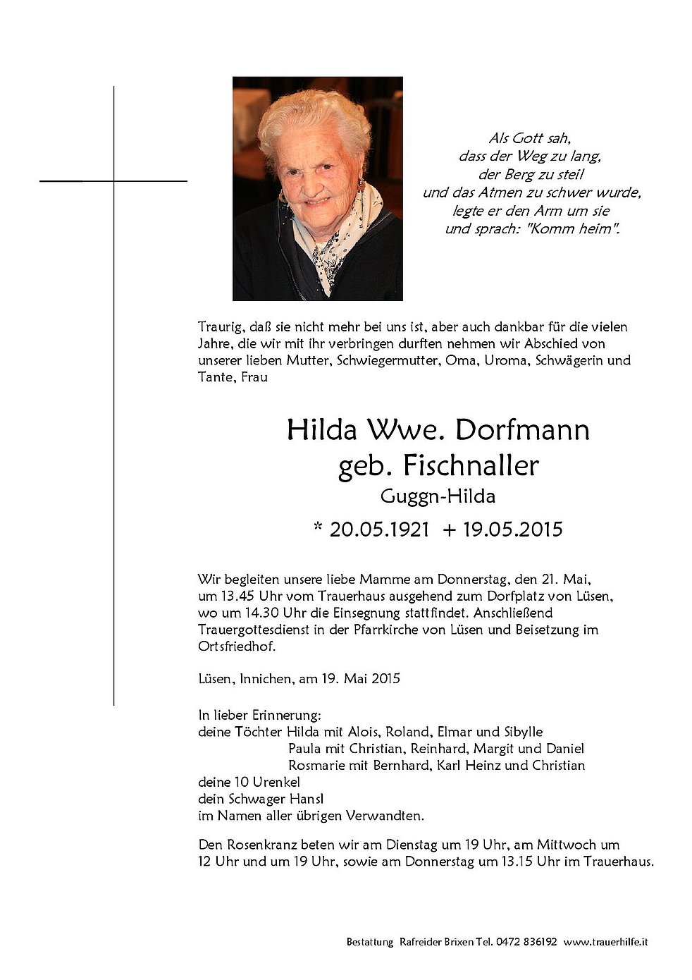 Gedankt sei dem Hausarzt Dr. Bruno Letrari und dem Pflegepersonal des Hartmanns Heim von Brixen für die liebevolle Betreuung, sowie allen, die an den Rosenkränzen und an der Beerdigung teilnehmen.