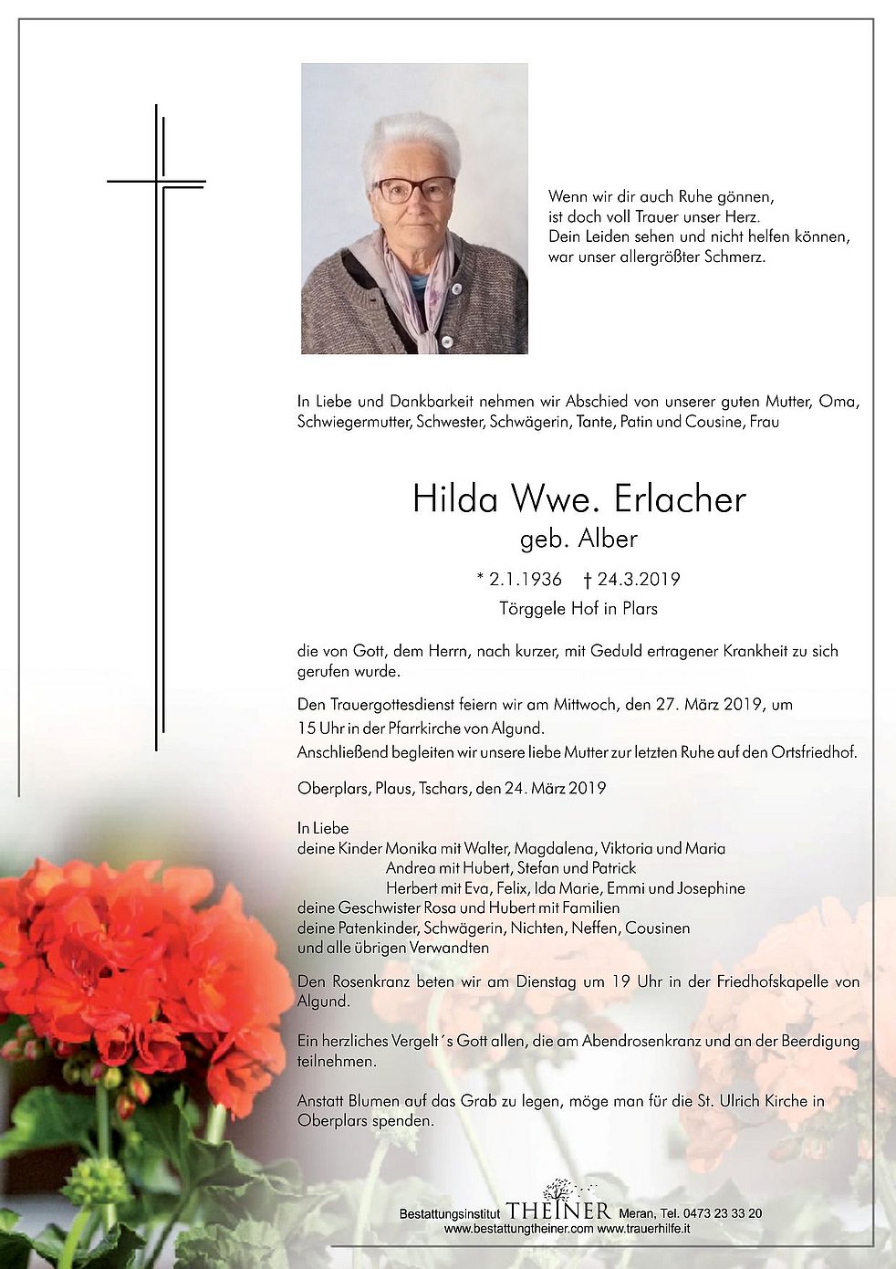Den Trauergottesdienst feiern wir am Mittwoch, den 27. März 2019, um 15 Uhr in der Pfarrkirche von Algund.
