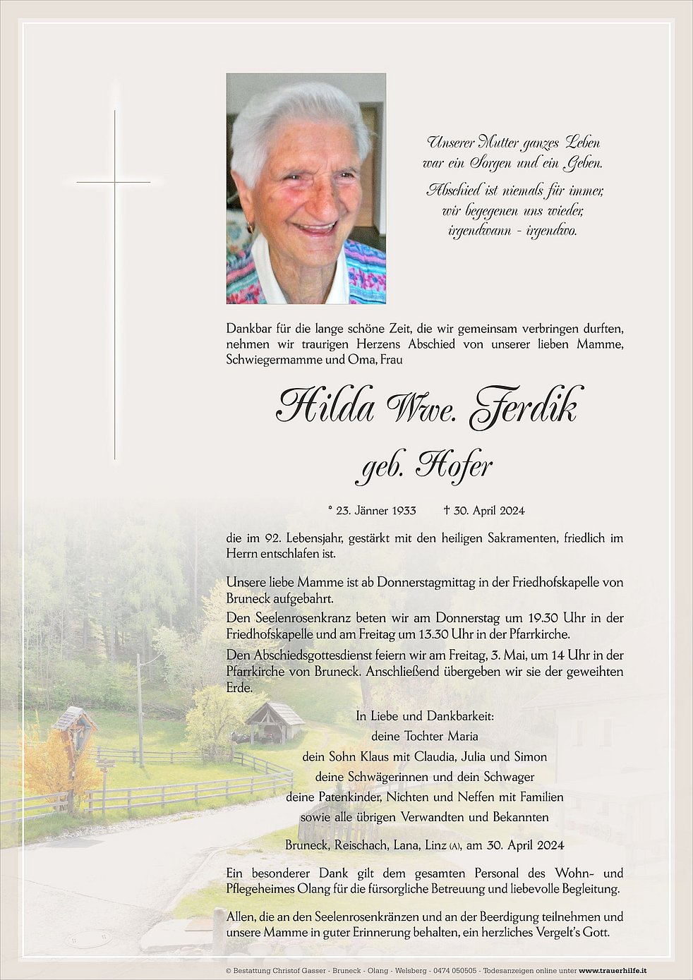 Unsere liebe Mamme ist ab Donnerstagmittag in der Friedhofskapelle von Bruneck aufgebahrt.