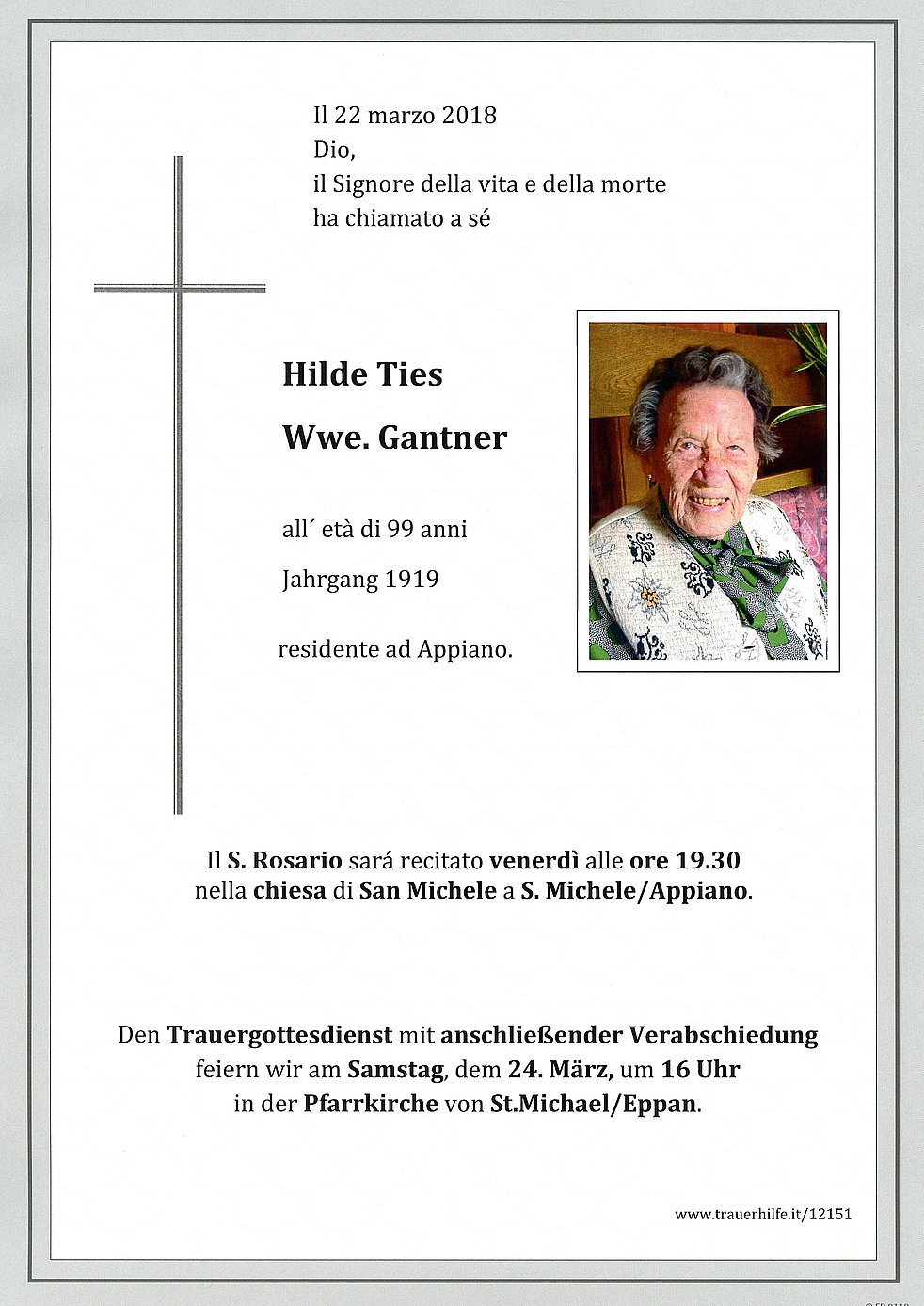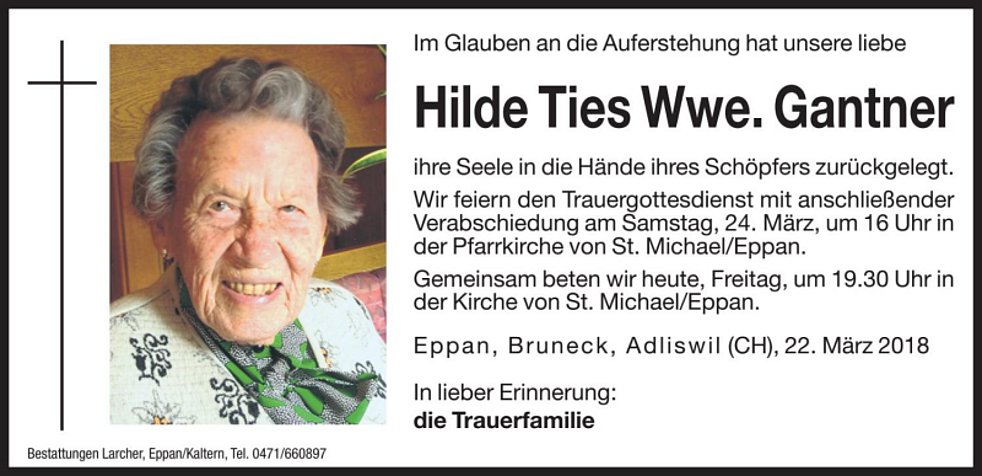 Celebriamo per lei la liturgia di risurrezione sabato, 24 marzo alle ore 16 presso la chiesa parrocchiale di S. Michele/Appiano. Preghiamo insieme -gemeinsam beten wir, heute, venerdì alle ore 19.30 nella chiesa S. Michele a S. Michele/Appiano.
