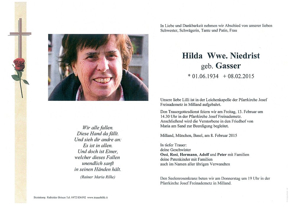 Den Trauergottesdienst feiern wir am Freitag, 13. Februar um 14.30 Uhr in der Pfarrkirche Josef Freinademetz. Anschließend wird die Verstorbene in den Friedhof von Maria am Sand zur Beerdigung begleitet.