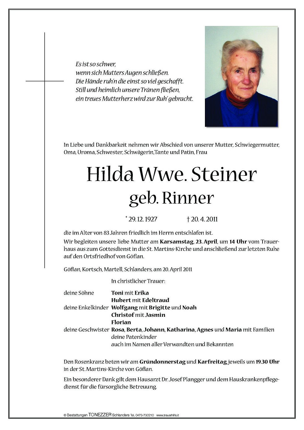 Ein besonderer Dank gilt dem Hausarzt Dr. Josef Plangger und dem Hauskrankenpflegedienst für die fürsorgliche Betreuung.