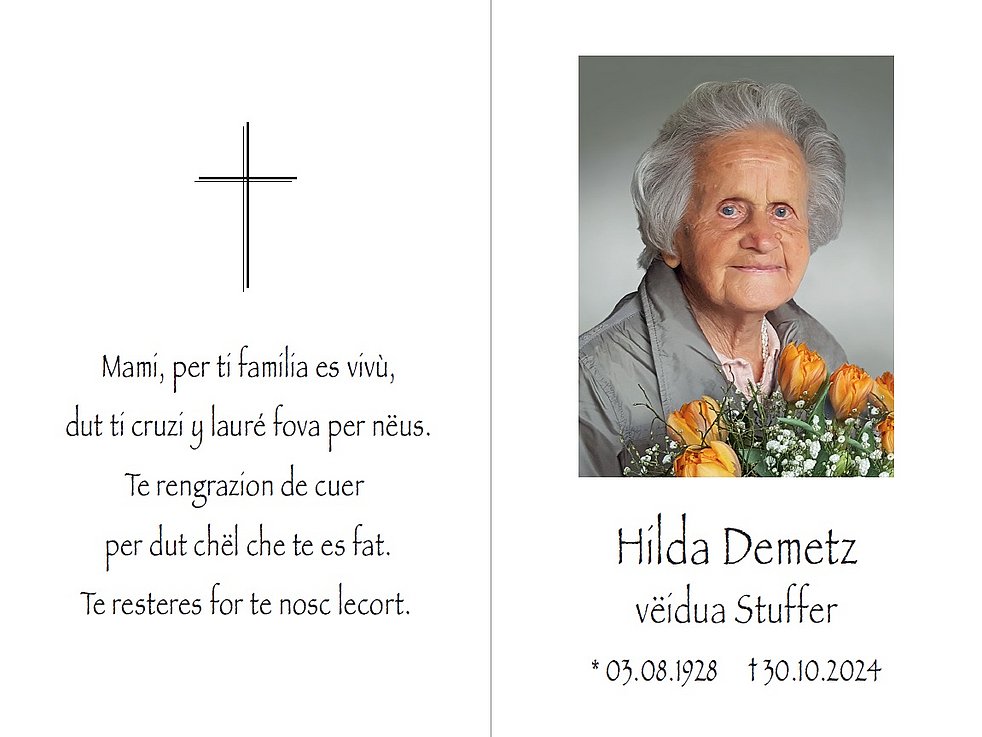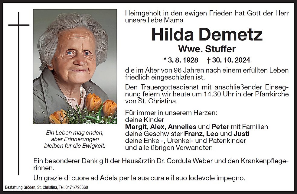 Den Trauergottesdienst mit anschließender Einsegnung feiern wir am Donnerstag, dem 31. Oktober, um 14.30 Uhr in der Pfarrkirche von St. Christina.