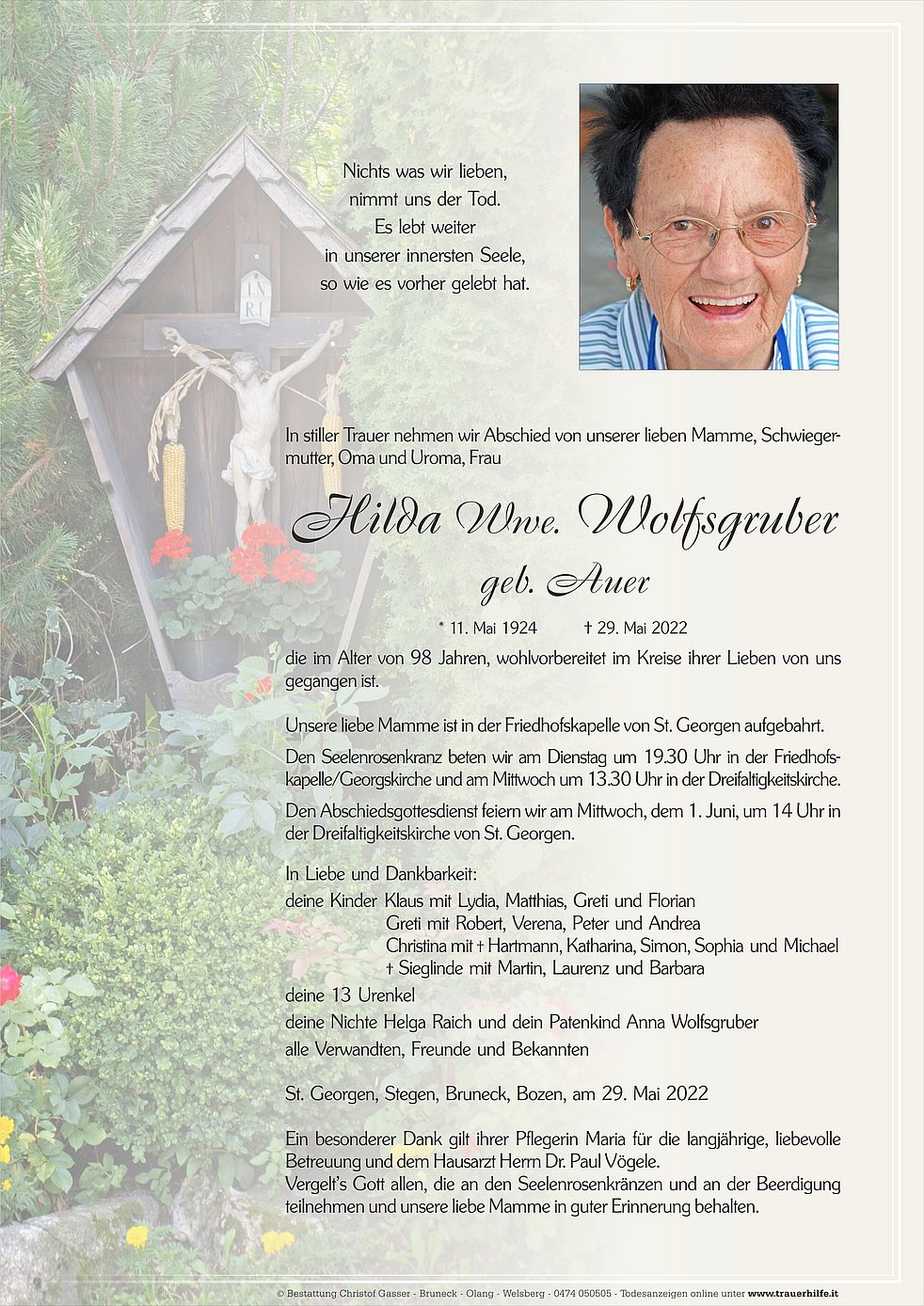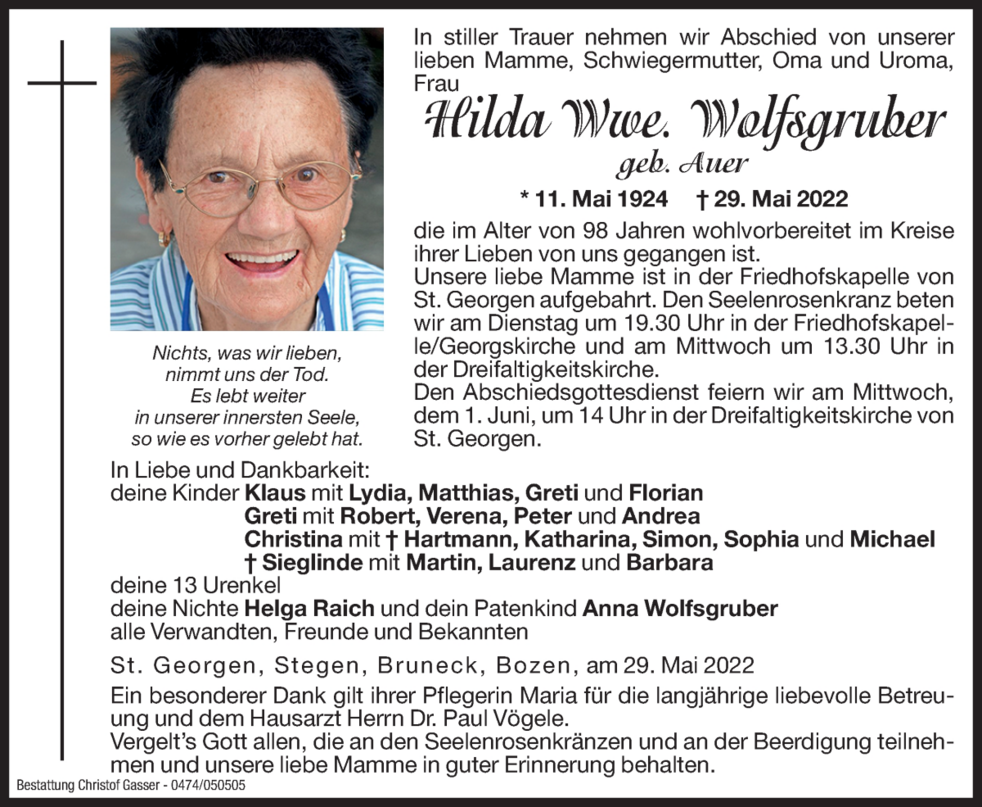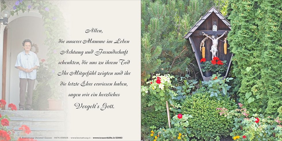Vergelt’s Gott allen, die an den Seelenrosenkränzen und an der Beerdigung teilnehmen und unsere liebe Mamme in guter Erinnerung behalten.