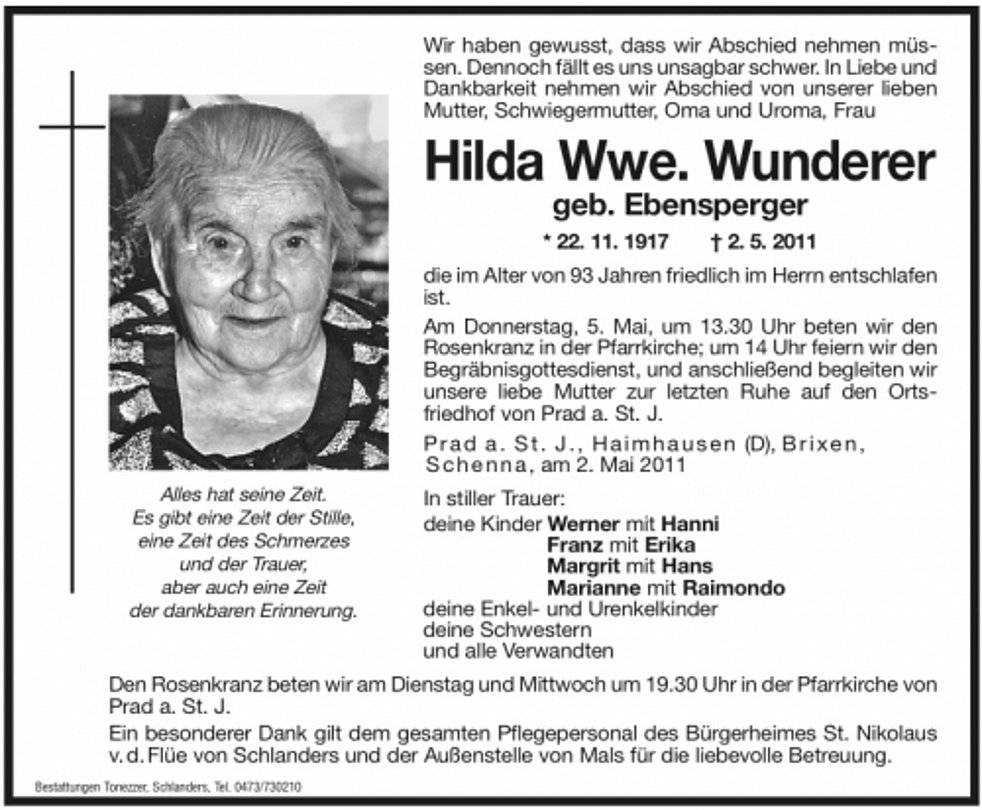 Am Donnerstag, 5. Mai, um 13.30 Uhr beten wir den Rosenkranz in der Pfarrkirche; um 14 Uhr feiern wir den Begräbnisgottesdienst und anschließend begleiten wir unsere liebe Mutter zur letzten Ruhe auf den Ortsfriedhof von Prad a.Stj..
