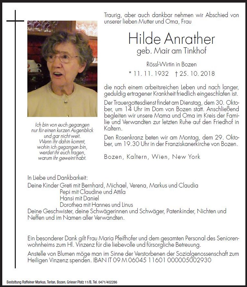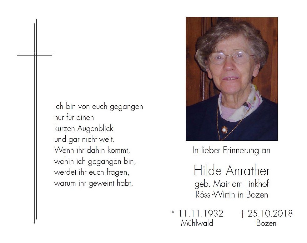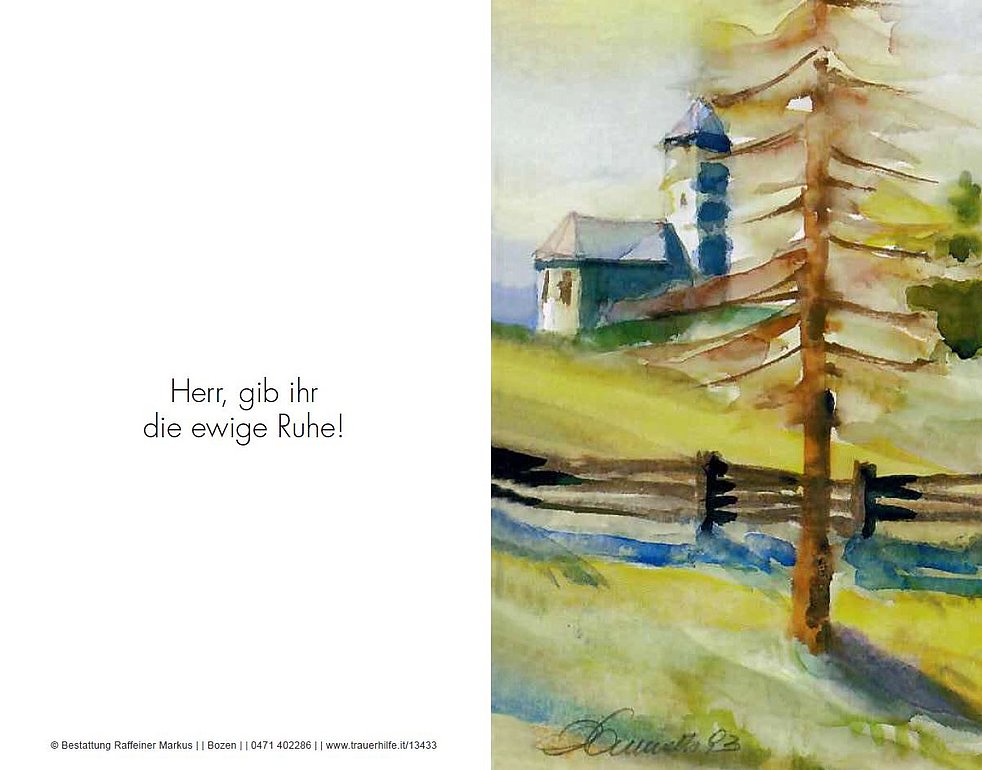Der Trauergottesdienst findet am Dienstag, dem 30. Oktober, um 14 Uhr im Dom von Bozen statt. Anschließend begleiten wir unsere Mama und Oma im Kreis der Familie und Verwandten zur letzten Ruhe auf den Friedhof in Kaltern.