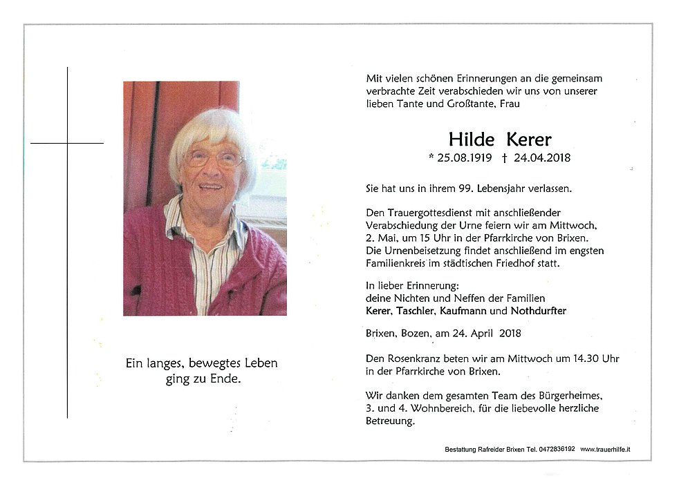 Den Trauergottesdienst mit anschließender Verabschiedung der Urne feiern wir am Mittwoch, 2. Mai, um 15 Uhr in der Pfarrkirche von Brixen.