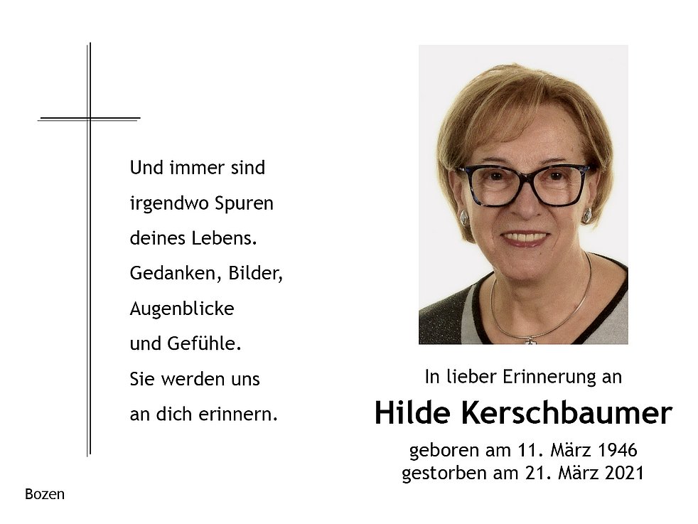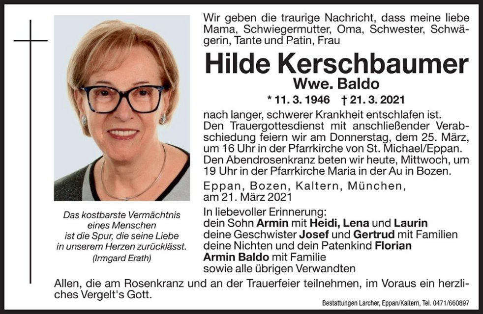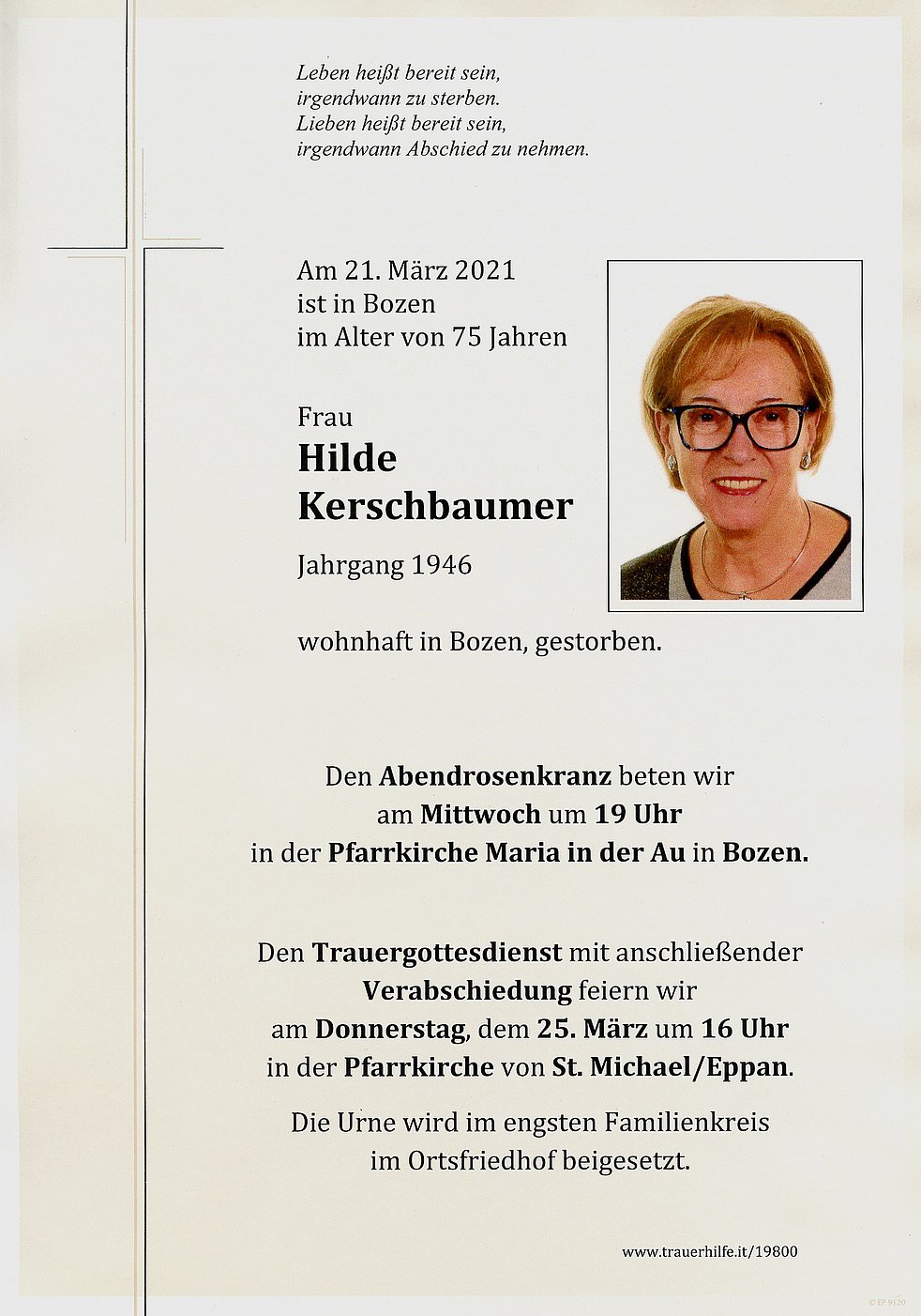 Den Trauergottesdienst mit anschließender Verabschiedung feiern wir am Donnerstag, dem 25. März um 16 Uhr in der Pfarrkirche von St. Michael/Eppan.